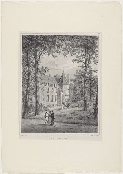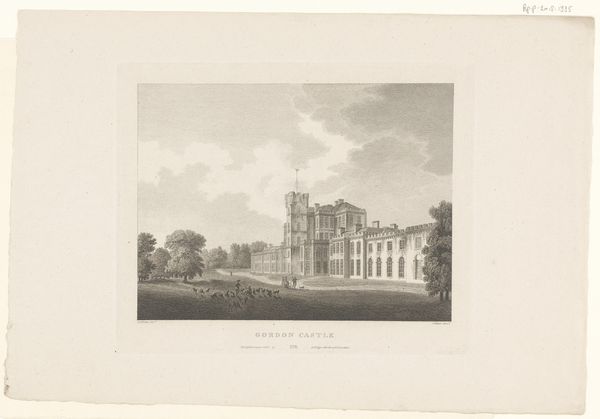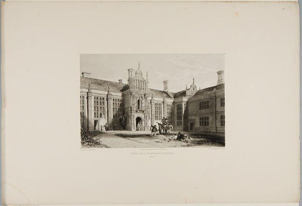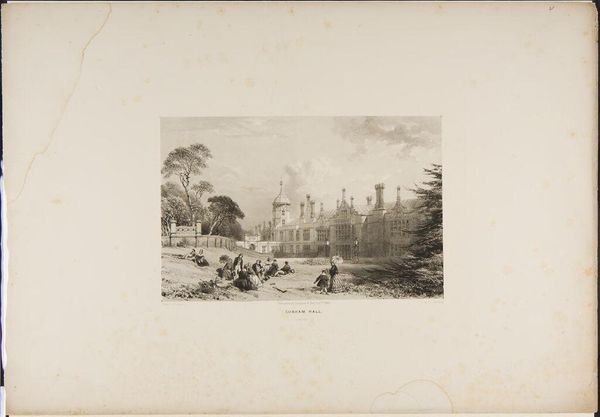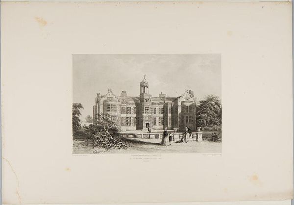 Curator: This is an engraving of Brereton Hall in Cheshire by W. L. Walton. Editor: What a stately presence! It seems to sit so serenely, almost like a memory solidified in stone. Curator: Indeed. Buildings like this often symbolize continuity, connecting generations through shared spaces and ideals. The architecture speaks of legacy and power, doesn’t it? Editor: Absolutely. The figures in the foreground seem almost dwarfed by the hall, really driving home the point of generational wealth and permanence. Though, perhaps the artist intended a bit of humanistic irony there, too. Curator: That's insightful. The etching technique enhances the detail, giving a timeless feel. The Hall itself is a tableau of symbols, each window a watchful eye, each tower a claim to history. Editor: It's like stepping back in time, isn't it? Looking at it now, I wonder what stories it holds, and the secrets those walls could tell. Curator: A tangible echo of lives lived and histories unfolding, captured in lines and shadows. Editor: That's true. It's quite evocative.