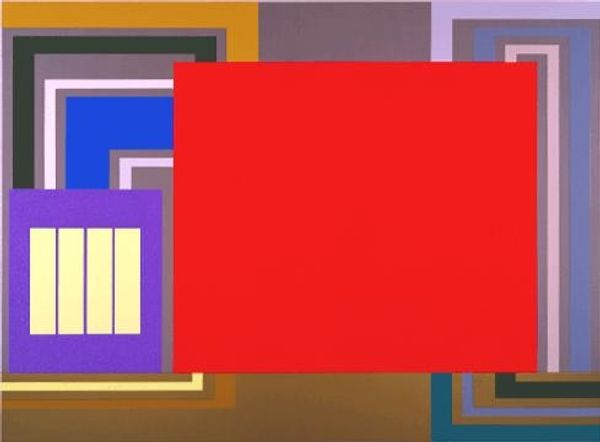 Editor: This is Peter Halley’s “The Time Machine” from 2002, made using acrylic paint. The blocks of intense colors feel both playful and strangely isolating. What jumps out to you in this work? Curator: I'm drawn to the stark geometry and the juxtaposition of colors. Halley is interested in how geometric forms, which he refers to as "prisons" and "cells," function within a larger social structure. Note the texture and the flatness, how each shape interacts with the other. What meaning can you derive? Editor: It seems to play with the idea of confinement and connection – the cells all abut each other, sharing edges. Is Halley suggesting something about the human condition? Curator: One could interpret it that way. His formalism, though, uses geometry as language. Focus on how the color relationships create tension and balance. See the complementary colors or even contrasting textures and how the light bounces off them. The glossy textures versus matte colors—notice their spatial effect. It’s more than just the message it’s the components of it. Editor: So the blocks of colors aren’t just containers but compositional elements? Curator: Precisely. Halley manipulates these elements to create a visually engaging space. How do the internal vertical bars in the "cells" modify your interpretation of their containing shape? Does the title of the painting influence your understanding of Halley's work? Editor: Yes, the bars within each color add this sense of depth that without them I would not find in the work, almost creating a world within each 'cell'. Thanks for clarifying that for me; I never considered it that way before. Curator: It is interesting how pure, basic elements such as forms and colours evoke so much interpretation. Hopefully our close look expands an appreciation for the compositional decisions involved.