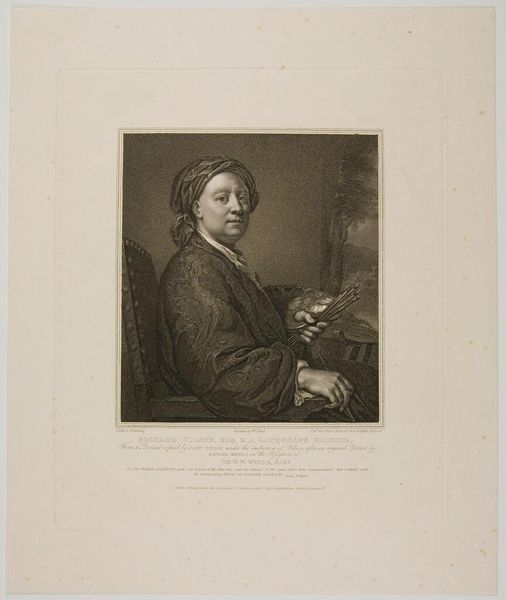 Editor: So, this is Domenico Cunego's engraving of Raphael Mengs. It feels pretty formal, almost stiff. What do you see in this portrait? Curator: Stiffness is a good word, but I see an artist deeply engaged in thought, a kind of controlled chaos. It reminds me of holding a creative fire, a struggle perhaps, before the explosion onto the canvas. Don't you think? Editor: I suppose that makes sense, the intensity in his eyes suggests that inner fire you are describing. Curator: Exactly! It's not just a face, it's a whole internal world rendered visible. Makes me want to grab a brush, doesn't it you? Editor: Definitely gives you a new perspective, like stepping into the artist's mind. Thanks!