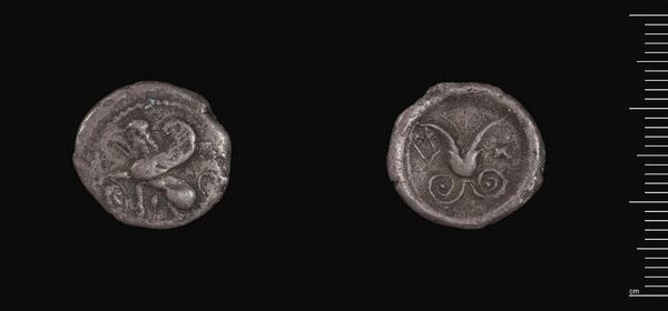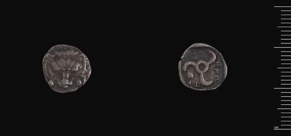 Editor: We're looking at a Drachm, a silver coin, minted by Hekatomnos, a ruler from ancient Caria. It's small, worn, but strangely powerful. What stories do you think this little coin holds? Curator: Ah, a bit of pocket change from the ancient world! It's incredible to think someone, so long ago, held this very piece. The images, a lion-like creature and a radiant sun, probably spoke volumes to them about power and divinity. What do they whisper to us today? Editor: Maybe of ambition, of rulers wanting to leave their mark, quite literally! It’s so different from how we think of money now. Curator: Exactly! Money then wasn't just a medium of exchange; it was propaganda, art, a tangible piece of history. It makes you wonder about all the hands it passed through, doesn't it? Editor: It really does! It’s like holding a tiny piece of a lost world.