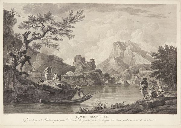 Curator: John Peltro’s engraving, entitled "Morning," offers us a serene landscape, teeming with both natural and architectural elements. Editor: The composition strikes me immediately—the dark foreground foliage frames a gentler scene, almost like a stage curtain being drawn. Curator: Indeed. The strategic placement of light and shadow directs our gaze toward the central, almost mythic, mountain in the distance. The mirroring of forms—trees on the left balancing the building on the right—establishes a visual harmony. Editor: And the figures! Don't overlook the shepherd and his companion. Could they represent innocence and experience—archetypes set against this idealized backdrop? The sheep drinking in the river also speaks of an idealized pastoral scene. Curator: Perhaps. Or it could be a symbol of the simple life, away from the city with all its industry. Editor: That, too. It's this interplay of elements—the natural with the man-made, the light with the shadow—that gives the image its symbolic richness. Curator: It is in this very layering that the art becomes not merely a depiction but an evocation of our relationship to the world around us. Editor: Absolutely, and examining those relationships offers endless insight.