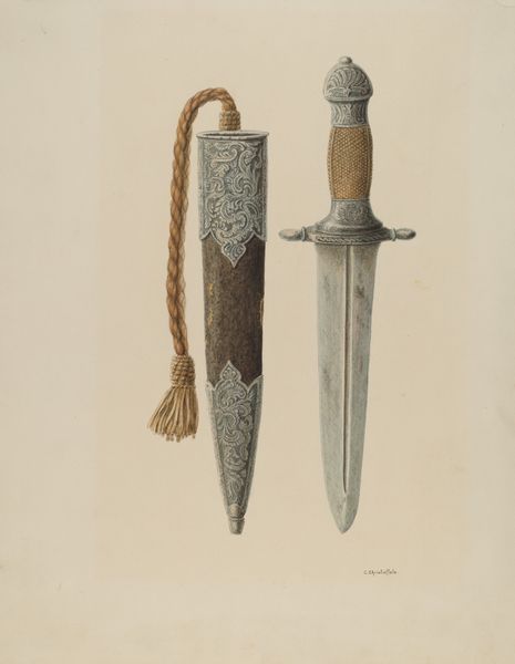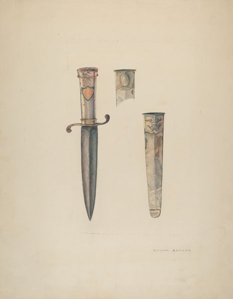 Editor: This is George Roehl's "Chopper," made in 1938. It looks like a watercolor and drawing. It's a pretty straightforward depiction of a kitchen tool, but there's something stark about it. What do you see in this piece? Curator: It’s fascinating how Roehl isolates this object, imbuing it with a monumental quality. The chopper becomes almost totemic. Tools, particularly those of the kitchen, often carry a strong emotional and cultural weight. Editor: Totemic? Curator: Yes, think about it. This isn’t just a blade; it’s a symbol of domesticity, labor, sustenance. Consider the archetype of the nurturing mother, the family hearth. This simple chopper can evoke all of that. Do you see the traces of rust and wear on the blade? Editor: I do. It looks very well-used. Curator: Exactly! Each imperfection tells a story. These visual cues speak volumes about daily life, the repeated gestures, the dedication to preparing food. And the handle? Editor: It seems almost worn smooth from use. Curator: Precisely. It holds the memory of every hand that wielded it, every meal prepared. The image invites us to contemplate the cycles of life and the significance of seemingly mundane objects. Editor: That’s a really interesting way to look at it. I hadn’t considered all those associations. Curator: Art often lies in reframing the familiar, inviting us to see the profound within the ordinary. The tool has become a symbol for so much more than just chopping. Editor: Thanks for helping me to appreciate this artwork! I learned a lot.