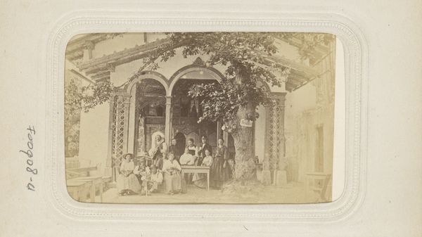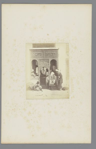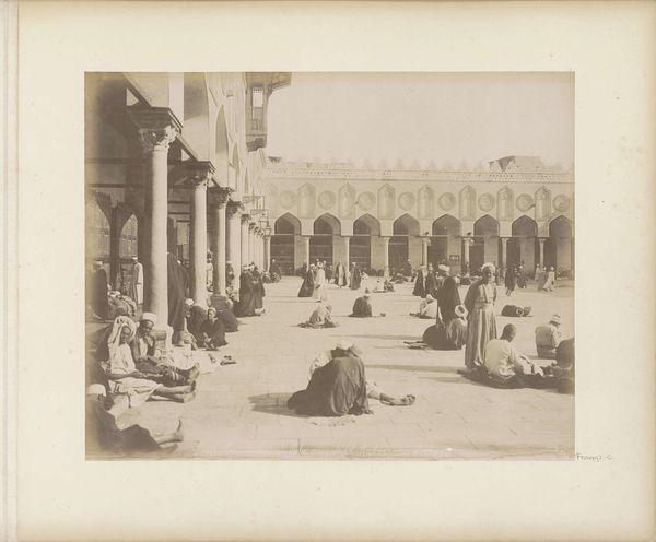 Curator: The piece before us is an intriguing gelatin-silver print from circa 1880 to 1900 by Étienne Neurdein, titled "Mannen wassen het gezicht of drinken op een binnenplaats"—loosely translated as "Men Washing Their Faces or Drinking in a Courtyard." It seems rather casual for a photograph, almost snapshot-like, doesn’t it? Editor: Snapshot-like, yes, but also imbued with a deep stillness. The monochromatic palette casts the scene in a kind of eternal present. The composition is striking – the geometric forms of the architecture versus the fluid postures of the figures. There's a palpable tension between structure and organic movement. Curator: Precisely! The photograph acts as a crucial artifact from the period. Neurdein was a prominent photographer who documented life in North Africa. Works like these were integral to shaping European perceptions of Islamic culture during a time of burgeoning colonialism. Editor: Absolutely, we see the ways in which photography played a vital role in the construction of Orientalist narratives. Consider the gaze implied by the framing— the presumed viewer as an outsider observing this quotidian scene. Are we invited in, or are we simply looking on? Curator: One might ponder Neurdein’s compositional choices as inherently loaded. For example, he employs repetition and depth through the arches, but the men’s activities in the foreground act almost as an ethnographic study. Editor: A formal device, undoubtedly! Note the careful arrangement of figures and objects; for example, the placement of footwear. Through an almost anthropological lens, one can appreciate these details as signifying particular rituals and modes of life, even while aware of the pitfalls of that analytical perspective. Curator: And indeed, despite the colonial implications, it is also undeniably an aesthetic object with beautiful tones. The details of light falling through the arches are really marvelous and almost meditative. It captures a fleeting moment in time, almost poetic in a sense. Editor: An astute summary. It's impossible to disregard the context while simultaneously appreciating its pure visuality. The dialectic that continues in my head highlights the very essence of analyzing historical pieces of art.