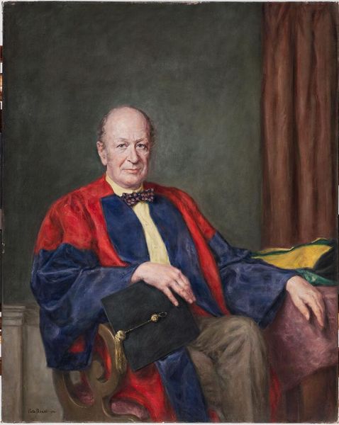 Joseph DeCamp created this dignified portrait of Rev. Daniel Merriman using oil on canvas. The composition employs a muted palette, dominated by somber blacks and grays, which imbues the subject with a sense of gravity and solemnity. A striking contrast is achieved through the vibrant red academic robe draped over Merriman’s shoulders, drawing the eye and framing his face. DeCamp’s meticulous brushwork and subtle play of light and shadow accentuate the texture of the skin and fabric, adding depth to the figure. This portrait evokes a sense of established authority, underscored by the visual cues of formal attire and the presence of books, traditional symbols of knowledge and power. However, the formal structure is not merely representational, it is also a semiotic system; the portrait communicates the social standing and intellectual background of the sitter, transforming the individual into a signifier of broader cultural values. The somber tone and structured composition invite us to reflect on the power dynamics embedded within portraiture and the ways in which these elements work together to communicate cultural meaning.