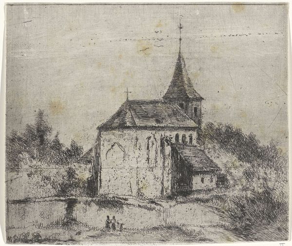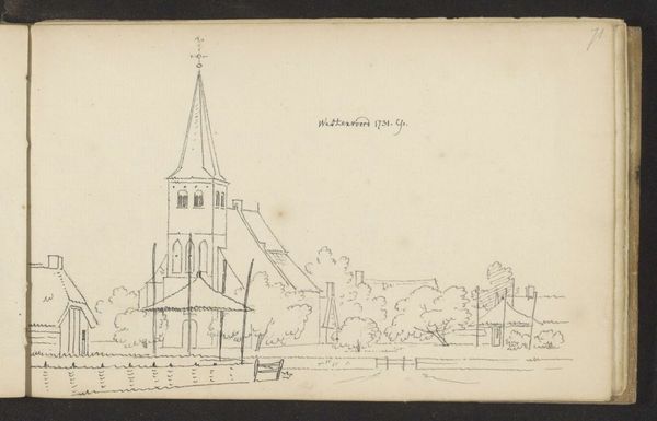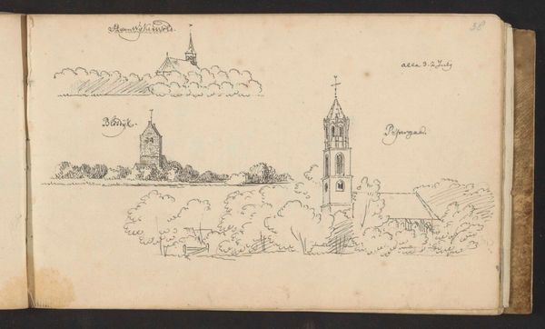 Curator: Standing before us is a captivating pencil and colored pencil drawing by Johannes Tavenraat from 1844, titled "Kerk te Bedburg." It's a part of the Rijksmuseum's collection. Editor: It has a wistful air to it, doesn’t it? A memory sketched quickly in soft graphite with a hint of color; like something glimpsed out of a train window. Curator: Exactly! The piece is remarkable in how it balances precision with a kind of hazy, dreamlike quality. Observe how Tavenraat meticulously renders the architecture of the church – the layered steeple, the small gothic windows. Editor: Yes, but he’s not just copying, is he? There’s something subtly…off, architecturally. The viewpoint is intriguing; it feels like it’s not about exact representation, more about impressions of grandeur and place? A kind of psychological rendering? Curator: I would say this reflects a deliberate compositional choice, typical of the period’s interest in realism tempered with emotional resonance. The loose rendering of the foliage surrounding the building helps amplify the central form. The subdued palette, though minimal, lends depth. Editor: What intrigues me further are the sketches in the margins. What can we gather? Is that perhaps, a separate spire… an idea of Tavenraat to incorporate it differently? It’s all on paper – we can trace how an idea springs to life! Curator: Well, one could interpret this sketch as an emphasis of the overall linear elements, it shows Tavenraat’s initial ideas but also functions as the key symbolic anchor, reinforcing that connection between the temporal world and some form of transcendent presence. Editor: I feel a subtle spiritual depth there! Overall it gives a tangible sense of bygone eras where faith and community, for people, was inextricably entwined into the landscape! Curator: Indeed. This seemingly simple sketch contains entire worlds within it; reflections on faith, artistic process and memory – elements intertwined through Johannes Tavenraat’s careful hand and visionary gaze.