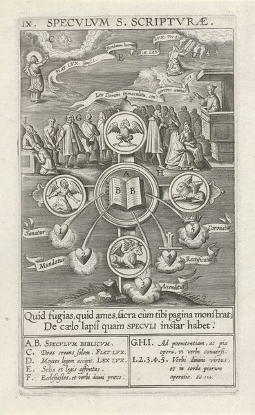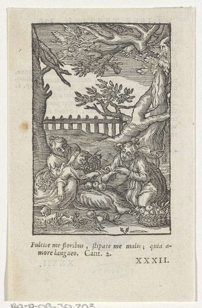 Editor: Here we have a Dutch Golden Age engraving titled "Doedelzak spelende man en een vrouw aan een waterkant," which roughly translates to "Bagpipe-playing man and a woman at a waterfront." It's anonymous and dated somewhere between 1625 and 1635, currently held at the Rijksmuseum. There's something wonderfully pastoral about the scene, almost fairytale-like with its circular composition. What springs to your mind when you look at this piece? Curator: Ah, yes, an anonymous gem! For me, this evokes the delightful dissonance of the Dutch Golden Age. We see a burgeoning merchant class alongside idealized visions of peasant life. I see it as less a 'realistic' depiction and more of a symbolic dance, doesn't it strike you as intentionally posed? Like a stage tableau. That bagpiper and the woman—they seem almost… frozen in time, offering us an 'experience' more than 'day in the life' so to speak. What are your impressions about how they fit into the landscape around them? Editor: That's a clever observation! I didn't think about the contrast between commerce and countryside ideals. I guess, compared to how 'rough' the landscape looks, their attire seems relatively clean. Curator: Exactly! It is fascinating how 'constructed' these ‘naturalistic’ scenes often were. Consider also how that meticulously rendered text becomes part of the artwork; language acting like another form. To truly understand something like this, we have to look beyond pretty scenery; instead, try to embrace those inherent contradictions that time etches within artwork such as these. Editor: That really opens my eyes. I was stuck on the pretty landscape aspect, ignoring everything around it. It's definitely a different story when you frame it as constructed— I will keep this in mind when visiting exhibitions in the future. Curator: Super, happy I could share a unique lens and hopefully changed perspectives! Now let's see what adventures wait in the next piece of work?