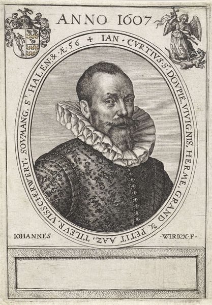 Curator: This engraving, "Marquard Freher," was created by Aegidius Sadeler II. Editor: It has a very serious, almost somber tone. The subject's gaze is direct and unwavering, with the heraldry adding to a sense of formality. Curator: Sadeler, active in the late 16th and early 17th centuries, demonstrates immense skill in capturing details, from Freher's attire to his facial features. The surrounding inscriptions also frame the image beautifully. I am drawn to the symbolism embedded in the heraldry. Editor: I agree, the texture is particularly impressive for an engraving. Knowing the history of portraiture, I find this piece fascinating as a statement of power and status. What do you make of the Latin inscriptions? Curator: They praise Freher's virtues and learning, linking him to celestial imagery, which would surely have resonated with contemporary viewers as it reinforced the social hierarchy. Editor: Indeed, such depictions played an active role in shaping public perception. It’s interesting to reflect on how such images legitimized authority. Curator: Yes, and how the symbolism continues to subtly influence our understanding today.