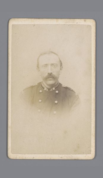 Editor: We're looking at "Portret van een militair," or "Portrait of a Military Man," a gelatin silver print, circa 1900-1920, by Jac. Schotel Szn. It's striking how the oval frame isolates the figure, and the tones are quite muted, giving it a sense of formality. What do you see in this piece? Curator: Well, first I see the meticulous composition. Observe how the photographer has expertly controlled light and shadow to sculpt the subject's face, accentuating his features. Note, too, the contrast between the detailed military uniform and the plain background; what structural elements does that juxtaposition offer the viewer? Editor: I suppose the emphasis is definitely on the figure, drawing my eye immediately to his face and the sharp details of his uniform. The artist forces the viewer to contend with a formal, distant portrait of a stern military man. Curator: Precisely. It compels the viewer to assess the sitter's visual rhetoric, to analyse the forms used to present this individual and his military rank. Further, examine the symmetrical arrangement of buttons and embellishments across the subject’s chest and collar line. Are you drawn to its symbolic intent or, as I am, towards an appreciation of its formal integrity? Editor: I can definitely see the argument for its formal aspects being most prominent. So much work has gone into capturing those minute details in silver gelatin. The uniform feels as essential to the portrait as the man himself. Curator: Indeed. In stripping away contextual cues beyond the immediate sartorial symbols and facial features, the photograph becomes less an insight into an individual, and more an articulation of the relationship between the photographic form and its representative subject. It really is a thought provoking construction, and a powerful composition. Editor: I hadn’t considered it that way. I was initially seeing it through a more historical lens, but I better appreciate the way that focusing on form encourages an investigation into its structure, its geometry. Curator: Exactly. Close observation always leads to a greater comprehension, if not greater questions.