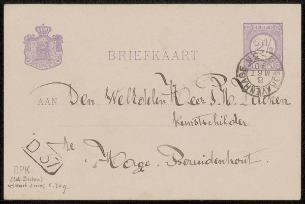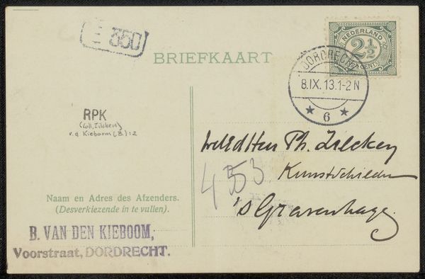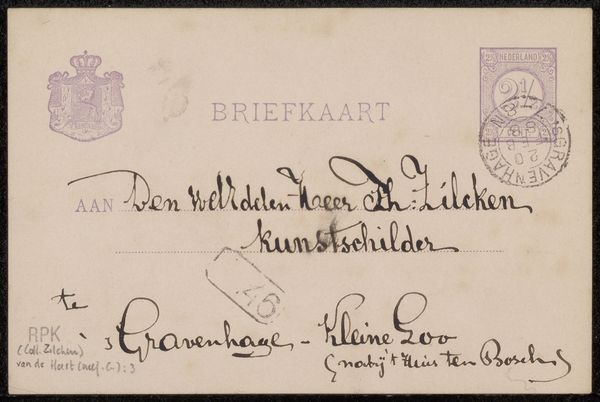 Curator: This is "Briefkaart aan Philip Zilcken," possibly from 1896, made by Cornelia van der Hart using pen and ink. The drawing itself is simple, but the lettering is what captures my attention. Editor: I see what you mean. I find the contrast of the elegant lettering with the more functional stamps fascinating. How do you approach this kind of work, considering it's "just" a postcard? Curator: I'm drawn to the materials and process of its creation, especially in understanding what constitutes "art." Here, the focus shifts from high art to the material reality: the pen, ink, paper, the postal system itself. It shows an intricate web of production and distribution. What do the stamps themselves tell you about its value and movement within a socio-economic structure? Editor: That's an interesting point! It’s not just about the visual aesthetic, but the systems it depended on, from postal services to the availability of materials. Curator: Exactly! Consider the labour involved—the manufacture of paper and ink, the postal worker’s journey, and of course, the artist’s time and skill. These are often unseen aspects of art consumption. We take for granted the accessibility of art and correspondence today, whereas the infrastructure implied here was central to artistic production. The postcard also operated as an advertisement of sorts when one looks at it as an artistic means to connect and perhaps create visibility. Editor: So it's almost a snapshot of the means of art communication and distribution during that time. I guess it shows me that it's so much more than "just a postcard." Curator: Precisely. And the context shapes the form, and the form contains that context. A useful lesson, wouldn't you say? Editor: Definitely! It encourages you to really dig into the nitty-gritty, I like that.