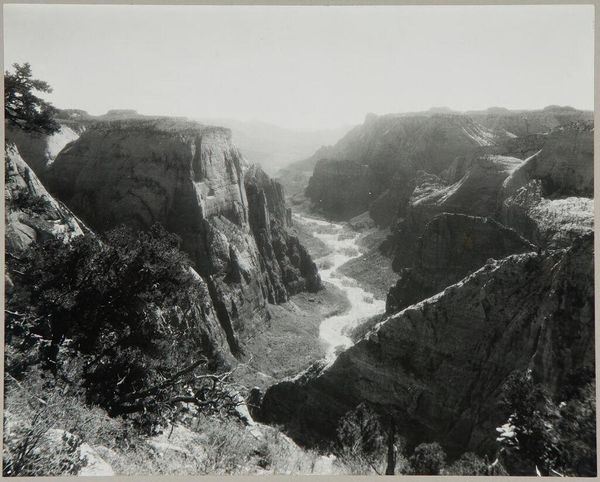 Curator: I’m struck by the sheer verticality of this landscape. There's a sense of the sublime, the power of nature dwarfing any human presence. Editor: This is "Detail of the East Wall, Lion Canyon, Utah," a photograph by John K. Hillers. It is a compelling image. But let's think about the context of the American West, then, as a site of both sublime beauty and violent colonial expansion. Curator: Absolutely. The canyon walls themselves seem to echo the historical power dynamics. The stark contrast between light and shadow could be interpreted as a visual representation of the tensions between settlers and indigenous populations. Editor: Indeed, the canyon itself becomes a symbol—a site of refuge, perhaps, but also of confinement and dispossession. What is held within such a geologic formation and for whom? Curator: The photograph’s formal qualities, the deep shadows and rugged textures, underscore these complex narratives. Editor: Precisely, making us consider the ethics of landscape photography itself. Curator: A potent reminder that landscapes are never neutral; they're always imbued with cultural meaning and political significance. Editor: Indeed, the weight of the past carves deep canyons into the present.