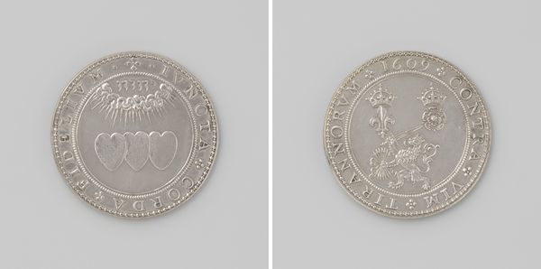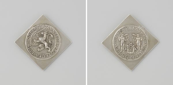 Editor: So this is a medal commemorating the Coronation of Frederik III of Denmark in 1648. It's anonymous and made of metal, possibly silver. The square shape is interesting... it kind of evokes a playing card or something. What do you make of this, knowing what you know about the art of that era? Curator: Well, let’s consider this object as a form of currency beyond its monetary value. Think about the labor involved in extracting and refining the metal, the crafting of the die, the striking of the medal itself. This isn't just about depicting power; it’s about the material assertion of power, isn't it? Who controlled access to the raw materials? Who possessed the technical skill to shape them? Editor: That's a good point. It represents a hierarchy of access. Was metal a standard for creating such medals at the time? Curator: Metal, especially silver or gold, was deliberately chosen. Think of its durability. The medal’s material inherently speaks of the perceived permanence and wealth of the monarchy. Engraving on metal also lends itself to mass production compared to sculpting marble. Editor: So, by choosing a material that lasts and can be easily replicated, Frederik is really ensuring his image will endure...almost like propaganda. Curator: Precisely! These medals weren't passively admired; they were circulated, exchanged, collected. The very act of owning or even handling it becomes a form of engagement with royal power. What is fascinating to consider is if commoners would have any access to these and in what quantity. How would that shape their perception of wealth or the royal family? Editor: This makes me realize how objects are rarely neutral. They are carriers of labor and power structures! Curator: Exactly. Every choice, from material to form, represents embedded cultural and economic values, which we must decipher.