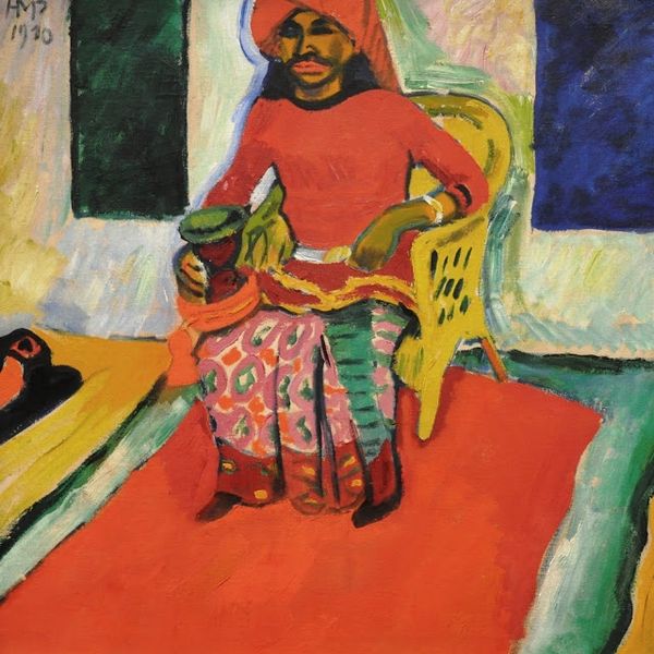 Editor: "Saida," painted by Kees van Dongen sometime between 1913 and 1920, hits me with a powerful sense of theatricality. The bold colours and almost mask-like quality are striking. What do you see in this piece? Curator: The Fauvist punch of colour really grabs you, doesn’t it? Her face is almost startlingly orange. For me, this portrait sings with the freedom of experimentation of the early 20th century, when artists dared to break away from conventional representation. Do you feel that boldness yourself? Editor: Absolutely, it’s exhilarating! I get a sense of liberation. What's particularly interesting to me is the blend of portraiture with these exaggerated, almost caricaturistic elements. It challenges the viewer, doesn’t it? Curator: Precisely. Van Dongen wasn't aiming for mere likeness. Look at how her eyes are rendered – simplified, yet piercing. What does the background tell you, if anything? Editor: The background feels almost unfinished. It's just swaths of gray, creating a sense of ambiguity and perhaps drawing all the attention to the subject. I like that it creates a focus. Curator: It allows Saida to exist outside of any rigid context. A dreamy, symbolic space, perhaps. For me, this painting is about exploring the emotional impact of colour and form, pushing boundaries to express a deeper truth about the subject. Editor: It’s really incredible to consider how much emotion can be conveyed through such bold and unconventional choices. Thank you for showing me that, it feels really enriching! Curator: The pleasure was all mine! Hopefully, now you look at this piece, it speaks to you with even greater intensity and depth!