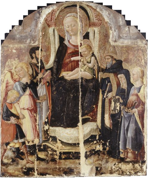 Curator: This is Girolamo di Benvenuto’s “Madonna and Child with Saints Nicholas of Tolentino, Monica, Augustine, and John the Evangelist,” currently residing at the Harvard Art Museums. Editor: My first thought? It’s like a meticulously arranged theatrical production, each character occupying their designated space. Curator: Precisely! The composition is carefully structured. Note the arrangement of figures in a symmetrical, almost pyramidal form, creating a sense of balance. Editor: But there's also something dreamlike about it, don't you think? The gold background, the halos—it’s otherworldly. Curator: The gold ground flattens the space, focusing attention on the interplay of colors and forms. Semiotically, the halos signify sanctity. Editor: It’s interesting how the rigid structure and gold background create this flat composition, but the subjects remain emotive. The artist created depth in an otherwise shallow space. Curator: Indeed, Di Benvenuto masterfully synthesized these elements. Editor: After some thought, I find the balance between the artistic formality and the emotional depth quite inspiring. Curator: A fitting observation on this artwork and its synthesis of form and content.
