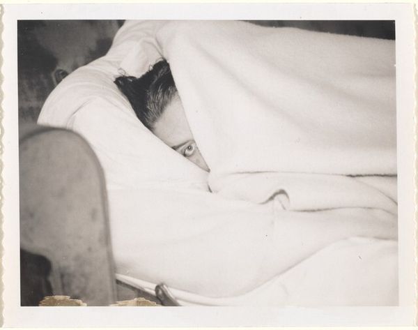 Curator: Bill Dane's gelatin silver print, Untitled (Berkeley, California), presents a poignant scene. Editor: It's immediately striking—the stark contrast, the intimacy, but also a vulnerability. The composition feels so exposed. Curator: Absolutely. The embrace evokes complex feelings about love, connection, and perhaps even loss within the cultural memory. The bare backs and clinging embrace are powerful symbols. Editor: The monochromatic palette emphasizes the textures—the fuzzy pillow, the rippled sheets. There's a certain rawness and immediacy due to the lack of color, highlighting the figures' forms. Curator: The anonymity afforded by obscuring the faces allows for broader identification, tapping into universal experiences of human connection. Editor: It’s a deceptively simple photograph that reveals layers upon layers of emotion and formal brilliance. Curator: A tender and thought-provoking piece, indeed, reflecting the beautiful complexity of human relationships.