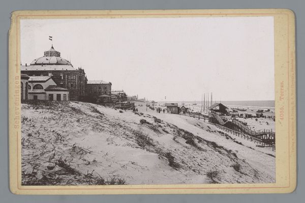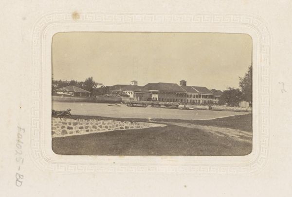 Curator: Right, let's discuss this intriguing image from between 1855 and 1885, credited to M. Wacker. It's an albumen print titled "Villa Pompejanum in Aschaffenburg." Editor: My initial reaction? It feels very... still. A quiet stillness, almost mournful, permeates the whole composition despite the architecture. The light-colored tones reinforce that subdued mood. Curator: I see what you mean. The albumen print process itself, with its soft focus and limited tonal range, definitely contributes to that feeling of distance, like a faded memory. If you focus on the composition, we have this solid, classical structure perched atop the cliff. What draws your attention? Editor: Immediately, it’s the sharp contrast between the rigid architectural form and the more organic, crumbling landscape below. Semiotically speaking, the Villa symbolizes order, rationality, even imperial ambition perhaps, juxtaposed against the relentless forces of nature that threaten to reclaim it. It's heavy with symbolic weight, don’t you think? Curator: Absolutely. And look how the photographer frames the villa; not as a celebration of architectural perfection, but nestled—almost besieged—by its surroundings. Even those little figures near the bottom – are they there to mark the scene, or emphasize our own fleeting temporality? They don’t seem real – more like ghosts in a machine. Editor: That idea echoes through this photograph! It's like a commentary on permanence versus transience, right? The photograph as an act of preservation, desperately trying to fix something as the actual thing degrades…I like that circular thought, of trying to fix time with the fixative. It creates this slightly haunting vibe because it is both an assertion of control and also a clear admittance of eventual loss. Curator: I completely agree. The choice of the albumen print, a process known for its delicacy, also enhances that theme. It’s interesting that they use these chemical concoctions. It sort of undermines it’s whole pretense and also shows us a little of what happened while it was made. Editor: It reminds me a lot of still life painting… capturing the brief vitality that slowly becomes a monument. On reflecting more fully, this feels deeply philosophical and even unsettling – less a depiction of the Villa, and more about the very essence of seeing and remembering! Curator: Exactly, well put!