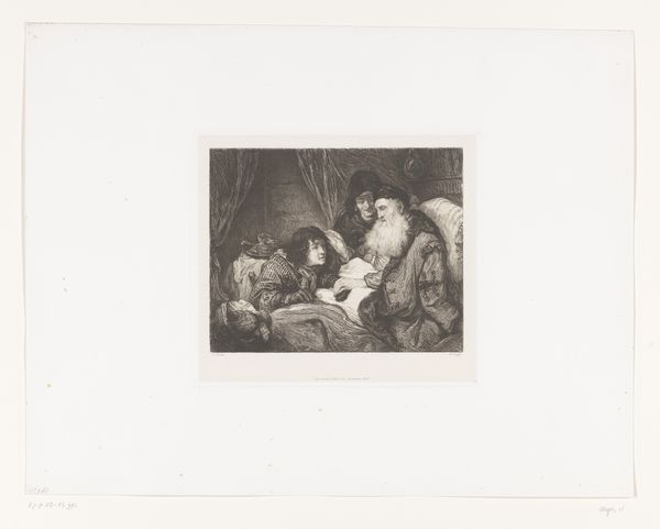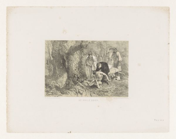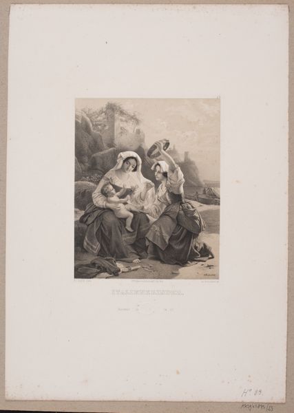 Curator: Looking at this print, "Italian Women and a Child by a Fountain", made between 1837 and 1855 by Johannes Christiaan d'Arnaud Gerkens, I’m struck by the Romantic idealization of rural life it presents. Editor: It's quite moving; a definite sense of melancholic beauty hangs in the air. There’s such careful attention given to light and shadow, despite it being a print. What do you think about the choice of the engraving medium itself? Curator: The engraving, using the precise, repeatable method, suggests interesting implications about art production during this period. How was the division of labour organized in studios, and to what extent were these reproducible images intended to be circulated among the broader populace? The consumption of prints like this would have undoubtedly shaped perceptions of Italy in the 19th century. Editor: Absolutely, and if you observe the way Gerkens employs the engraving technique, you can see the rich texture and gradations he’s able to achieve that mimic the qualities of painting. Consider also the socio-political role of artwork – this Romantic idealisation of Italy, what purpose does that serve in the Netherlands? Is it pure escapism or something more complex? Curator: Escapism certainly plays a role, but consider how genre scenes also affirmed and promoted the viewer’s national identity. These portrayals reinforced specific societal norms about womanhood, childhood, and labor and emphasized their relationship with the landscape. Editor: Interesting! So we have the artist’s technique, the materiality of the print, and the social commentary all layered within this single image. Curator: Precisely! It really underlines how much can be unpacked by closely considering both the image and its historical existence as an object of mass consumption. Editor: Examining the print this way, considering its materiality and function, definitely opens up a richer and nuanced understanding of this romantic scene.