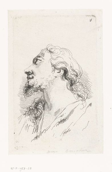 This etching, "Gezicht van een oude man met baard, in profiel naar links," was created by Stefano della Bella in the 17th century. The print is a study in contrasts, rendered in delicate lines that define the contours of an old man's face. The composition is simple, focusing entirely on the head and shoulders in profile. Bella's masterful use of line is particularly evident in the beard and hair, where a dense network of strokes creates a sense of volume and texture. Note the delicate, almost fragile quality of the lines that trace the wrinkles and folds of the skin. This attention to detail invites us to consider the passage of time and the marks it leaves on the human form. The etching, with its emphasis on line and form, challenges fixed notions of beauty, reminding us of the value in capturing the essence of a subject through precise, structured observation.