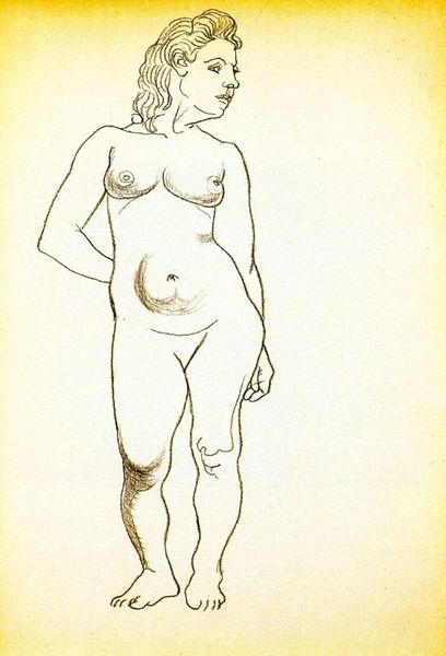 Curator: I find "Standing female nude" to be strangely…stark. Editor: Well, the linearity definitely lends itself to that reading. It’s a 1923 drawing by Pablo Picasso, one that demonstrates his Cubist sensibilities, wouldn’t you agree? Curator: Precisely. Look at how Picasso has used line to abstract the female form. There is a detachment, wouldn’t you say, created through these fragmented planes, as she leans upon a rigid block, almost as if placed on display. What’s your read of that element, editor? Editor: That support becomes vital. It symbolizes, to me, the many constraints put upon the representation of women’s bodies throughout history and still today, in many sectors. By reducing his subject to outlines, Picasso challenges the conventional ideal. The flatness resists easy consumption or objectification. Curator: A fascinating social read. It’s true that even with its simple execution—drawing only— the nude almost feels architectural in its structure. I can understand, and somewhat relate, to a feeling of disaffection with conventional art structures in 1923, a sort of proto-brutalism, and thus find a bit of warmth to these harsh outlines. Editor: But it also reveals its socio-political context. During this period, anxieties around female autonomy were very palpable. Picasso, deliberately or not, taps into the era’s unease. In 1923, did people, as audiences, expect sensuality, in response to such art? Or even expect more naturalism? How might audiences feel about Picasso's work? Curator: Absolutely. He avoids the expected sentimentality entirely, it is pure form. In a purely material and aesthetic lens, “Standing female nude” demonstrates Picasso’s grasp of line and volume— it is clear he challenges and deconstructs the female nude. Editor: And doing that reveals that he acknowledges the constraints imposed upon those figures. Thank you. Curator: Thank you.
