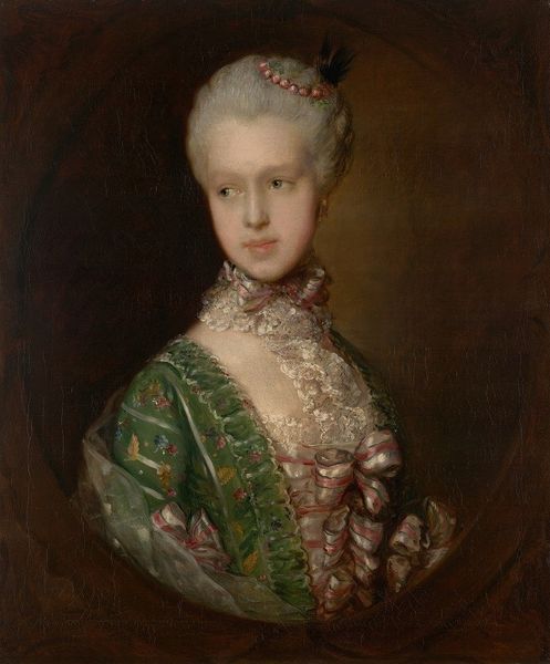 Curator: Marcello Bacciarelli painted this portrait of Marie Christine in 1766. It is currently held at the Kunsthistorisches Museum in Vienna. Editor: What immediately strikes me is the formality of the composition. It's balanced, refined, and the subject’s posture conveys an impressive elegance. The colour palette is also striking: muted greys that contrasts with the brightness of her red dress. Curator: Absolutely, and what we see in her attire are signifiers of her status and of the historical context. This was painted during the Rococo period, known for its extravagance, but also for its shift in aristocratic taste towards a self-conscious embrace of 'naturalness.' Marie Christine, as an Archduchess, was bound by those expectations even as trends shifted. The tension between displaying status and conveying approachability would have been a daily experience for her. Editor: You can see this conflict mirrored in Bacciarelli’s brushwork; notice the precise detailing on her jewelry, contrasted against the softer treatment of the drapery. It’s almost like a game of visibility, each area vying for the viewer's attention, structured as contrasts. Curator: Considering her role in Austrian political and intellectual life during the Enlightenment, it is probable that this contrast in styles also indicates her attempts to strike a balance between her public role and the demands of tradition. I find the background rather insightful, in the almost obscured, garden setting. Editor: Yes, there’s a faint idyllic touch to the overall setting, framed within very careful proportions and lines. Curator: These paintings provide incredible access to lived social complexities that may otherwise be overlooked. This portrait of Marie Christine is more than just a visual representation, it tells the story of identity as it intersected with gender, class, and politics in the late 18th century. Editor: Indeed. Observing Bacciarelli’s careful compositions and stylistic choices reveals a powerful convergence of materiality, structure and symbolic significance. Each element is carefully placed, creating not just a visual experience, but also a discourse on beauty, order, and class representation.