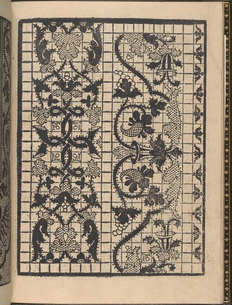 Curator: My first impression is an elaborate labyrinth of forms and textures. The contrast of the dark ink against the paper creates an intriguing visual puzzle that feels almost infinite. Editor: This is a page from Iseppo Foresto's "Splendore delle virtuose giovani," dating back to 1564, currently residing at the Metropolitan Museum. It showcases a compilation of various patterns intended for needlework and lace making, an exquisite example of a 16th-century pattern book. The design uses a pen, in either ink or applied as print on paper, underscoring the era's emphasis on both craft and practical skill. Curator: Knowing it was intended for needlework throws the whole piece into a new light. Suddenly the repetition and the structure become less like abstraction and more like the framework for tangible creation. Do you think the rigid grid helps or hinders creative variation within these crafts? Editor: It's a bit of both, really. On the one hand, this grid provides a systematic foundation, ensuring uniformity across the crafted textiles; think of it as the pre-printed stencils that aided skilled, yet not elite, artisans in meeting demands with precision. Simultaneously, within this system there lies room for individual expression as artisans would be tasked to interpret and realize the suggested forms. The geometric and the natural world mix here in ways that are so very Renaissance in tone and aspiration. Curator: I imagine these pattern books offered opportunities, maybe freedom. The spread of the printing press really did democratize art, or access to it. Imagine what women were able to create armed with such books. Editor: Absolutely, it broadened artistic participation beyond traditional academies, emphasizing useful labor and artistry merged with an expanding marketplace for textile and luxury goods. Consider each replicated leaf and swirl; within them existed aspirations of wealth and access, intricately linked with labor, both in conceptualization and execution. Curator: I appreciate how looking at something so outwardly decorative ultimately unravels so much about labor and social change during that period. You begin to think beyond aesthetics toward lives being transformed by craft. Editor: And seeing how those changes are carefully penned and preserved, you gain not only historical knowledge but a deep appreciation for each connecting point within those decorative vines. The image itself has turned to an artifact: an embodiment of its moment.