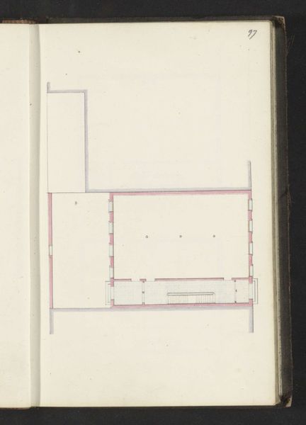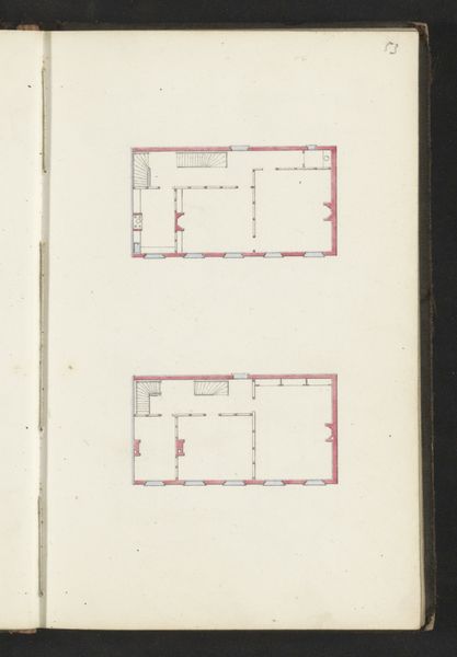 Curator: This delicate line drawing is titled "Fundering," dating back to about 1864. It was created using pen on paper by Willem Springer Jr. Editor: My first thought? Blueprint for a particularly minimalist dollhouse. Or maybe a slightly spooky boarding school. There’s something stark about its geometry. Curator: Yes, well, “Fundering” is Dutch for “Foundation.” Springer, who seems to have been drawn to architectural subjects, likely captured this particular building's blueprint to reflect on the essential support system, not just literally, but also metaphorically, of course. Editor: It does invite thoughts on structure, doesn't it? These neat rows of what I imagine are supports almost remind me of ancient ruins laid bare. Pink ruins! Makes you wonder about what vanished to bring these foundations into view. What ghosts live here? Curator: I think you're seeing past, present and perhaps, potential futures—a collapsed empire awaiting rebuilding, to make it symbolic perhaps, a statement about temporal and cyclical aspects, as we build again upon what was established? What might have stood where all we see now is geometric patterns. Editor: Definitely something cyclical in it, the repetition is mesmerizing in a calming and reassuring sense, and the almost whimsical, fragile linework, the hint of blush in those pink squares - feels like finding strength in unexpected places. Almost vulnerable. Curator: Exactly. It presents a paradox. That pink injects a note of warmth, suggesting, perhaps, that the cold precision can still suggest an enduring presence. This piece reminds us that, underneath everything solid, there is always vulnerability but it should not frighten us, but encourage. Editor: Indeed. A lot to contemplate within a few precise lines on paper. Now, when I see the buildings rising. Thanks, Willem. Curator: Yes, something so linear contains great complexity. Thanks to Springer Jr. indeed, this 'skeleton' of space leaves us room to think.