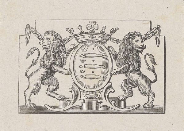 Curator: At first glance, this work, executed in pen and ink, conveys a sense of archaic authority despite its miniature size. The symbolism feels deliberately constructed, potent in its stark lines. Editor: Precisely! What we're looking at is a 17th-century etching that carries the title, "Vignet met het wapen van de stad Amsterdam"—A Vignette of the Amsterdam Coat of Arms, by an anonymous artist. Its power, in my opinion, lies in the ability of civic heraldry to shape collective memory. Curator: Notice how the twin lions flanking the shield project a certain regality; they guard the central image beneath a regal crown, creating an almost pyramidal composition. Heraldic lions, potent across cultures, embody courage, nobility, and sovereignty here, their fierce visages softened, almost domesticated. Editor: Domesticated perhaps, yet these emblems, and indeed their very presentation within a miniature print available for wide distribution, subtly communicated Amsterdam's growing global power in the Dutch Golden Age. These weren't just artistic flourishes but carefully constructed public images. Curator: True, these weren't mere artistic choices. The "XXX" on the shield isn't an accident. It symbolizes courage, steadfastness, and mercy, but the precise meaning has been debated. Regardless, it acted, and still does, as a potent trigger of civic belonging. It anchors identity. Editor: Absolutely, these images circulated widely, appearing in prints, books, even maps. By studying their prevalence, we get a clear sense of how the Amsterdam elites sought to shape a specific, unwavering narrative of their city. The continuous visual echoes amplify the state's narrative. Curator: I wonder about its circulation within the city, considering it as part of an array of commercial and legal visual representations. I imagine citizens would encounter such imagery routinely in public spaces or documents—a continuous reinforcement of power, as you point out. Editor: Exactly. So while a modern viewer may see simply a historical curiosity, the 17th-century public encountered a far more loaded image. Studying pieces such as this, no matter how small, is vital if we're to truly grasp how the Dutch Golden Age manifested in the everyday. Curator: An assertive representation, then, shaping minds as well as spaces, even today. Editor: Indeed, still informing perceptions, highlighting that civic iconography has lasting consequences on our mental geography.
