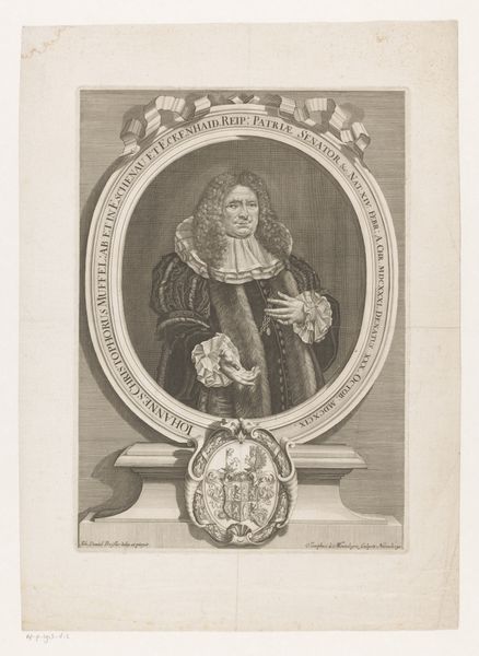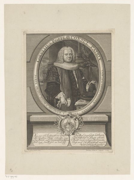 Curator: Immediately, I'm struck by the sheer craftsmanship in this engraving. The level of detail is extraordinary. Editor: Indeed. This is "Portret van Jacob Langermann," dating from around 1738-1740, currently housed here at the Rijksmuseum. It's an engraving by Christian Fritzsch of a senator of Hamburg. Looking at him, he seems very self-satisfied, doesn't he? Curator: The layering of the image is what stands out to me. The senator framed in what seems to be an oval portrait hanging within the space, plus the added embellishments of a draped curtain, elaborate frame, and supporting architecture makes for a multi-tiered process. It speaks to Baroque extravagance. The labor and materials signify the social standing being depicted. Editor: Definitely, all this to amplify his status and perhaps deflect attention away from the sitter himself. Langermann's privileged position is underscored. In the 18th century, class and gender constructs rigidly defined the opportunities for individuals. It is the Age of Enlightenment, but it also still a period of incredible social divide. Who got to have their portrait memorialized, who controlled these images and their narratives? Curator: Those engravings involved highly skilled labor, a formal printing press with heavy mechanical parts, inks sourced from varied pigments… it's not just an image but also the outcome of collaborative effort. How might this method have influenced art distribution and popular accessibility? Editor: An important question. Certainly, the ability to reproduce and distribute such images, however limited compared to today, could begin to influence public perception of figures like Langermann and what he represented. Were prints like this simply propaganda, or did they serve a broader function in constructing social identity? Curator: Maybe that depended on who was purchasing, trading, or obtaining them. Was it other elites consolidating a shared idea of status, or middle class merchants who wanted to associate themselves with status by purchasing smaller prints, which made such imagery highly desirable and profitable, creating a much wider market for distribution? Editor: Right, these items became aspirational tools. This one print gives rise to so many fascinating questions about that moment in history! Curator: Agreed! I appreciate seeing beyond the simple image and engaging with the physical creation of this historical object. Editor: Me too – understanding its historical contexts offers new entry points for viewers in the 21st century.