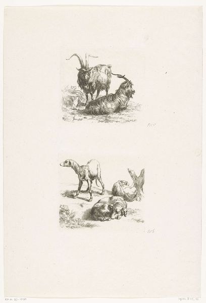 Curator: Let's talk about Bernard Picart’s "Two Lions," created in 1728, here at the Rijksmuseum. What are your initial thoughts? Editor: The ink drawings, displayed one above the other, initially convey a sense of quiet observation. There's a softness to them despite the subject matter. They almost seem to be sketches from a naturalist’s notebook. Curator: Indeed. Lions, especially in the Baroque period, often served as emblems of power and royalty, mirroring societal structures and divine right. But here, stripped bare to pen and paper, what statements are we left with about those symbolic roles? Editor: I find myself focusing on the paper itself. Its availability, its cost...pen and ink weren't particularly expensive but were not accessible to everyone. Who could afford this study? Was this piece linked to someone commissioned for more expensive artworks, like paintings or tapestries featuring lions? It’s all about the chain of labor and access. Curator: An interesting angle! And consider how the detailed, yet slightly languid, portrayal counters earlier depictions of lions solely as aggressive beasts. These are rendered in a manner that invites a kind of contemplation—almost inviting one to sympathize with the powerful animal. Editor: Yet it's just an initial sketch, an exploratory sketch—we lose a great deal of context to its specific purpose, so any kind of intent that could be projected upon the symbols might well have been in progress... Curator: Right, the ambiguity. Was he preparing designs for a decorative project? Or could he have intended to publish prints on animals as popular natural history became fashionable? The possibilities for meaning were broadening alongside social and intellectual shifts. Editor: Thinking about production, it shows us the material side of representation— how the cultural image is actually constructed step by step. The image feels accessible to copy or imitate; the medium lends itself easily for the transfer to other productions, be that in cheaper prints or other goods. Curator: This simple ink drawing offers a microcosm of evolving views on nature and authority in the 18th century. A study not just of form, but a re-evaluation of inherited symbols. Editor: Absolutely. It pushes us to consider the physical processes that underpin those very symbols.