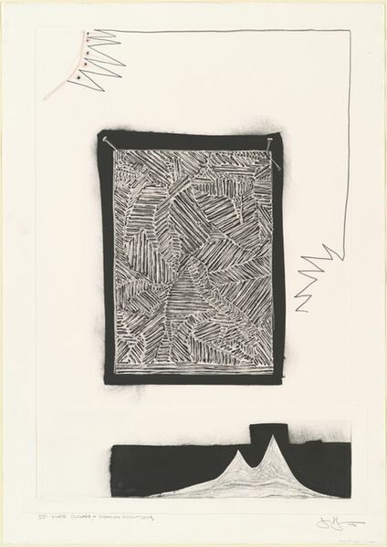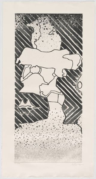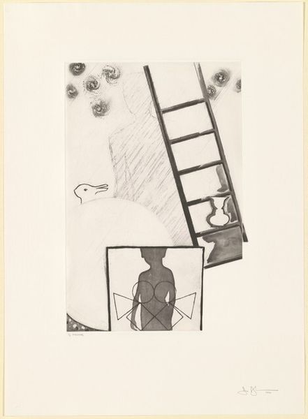 Editor: We're looking at Jasper Johns' "The Seasons [14th state (Spring)]," a mixed-media print from 1987. It's a complex image, almost dreamlike. The overlapping forms and varying textures create a really intriguing surface. How do you interpret this work? Curator: It's a sophisticated composition, certainly. Notice how Johns orchestrates the surface through varied mark-making, building layers of meaning via purely formal means. The interplay of positive and negative space generates visual interest, with the diagonal stripes, for example, creating a dynamic tension against the static figurative elements. Do you observe any particular relationships between the various images? Editor: Well, there's the shadowy figure in the square, then this vase or amphora repeated elsewhere… and the little rabbit. It almost feels like a collection of memories or fragments of an experience. Is the figure an allusion or something else? Curator: Its presence primarily signifies a play of form and shape, and how the different visual elements in the etching intersect. The human body reduced to outline—it allows the artist to dissect visual structure, rhythm and proportion across the picture plane. It asks viewers to engage with how the lines operate. Editor: So, less about what each symbol means and more about how they all work together visually? Curator: Precisely. The objective isn’t decoding a narrative, but rather understanding Johns’ visual syntax. How does the texture interplay, create rhythm? The artist makes meaning constructing a purely abstract dialogue. What do you think about this now? Editor: I get it now! The elements interact to create visual harmony but are also discrete, retaining an intriguing sense of independence. This print makes one see art in terms of shapes and values, not symbols and hidden meanings. Curator: A rewarding observation.