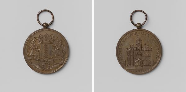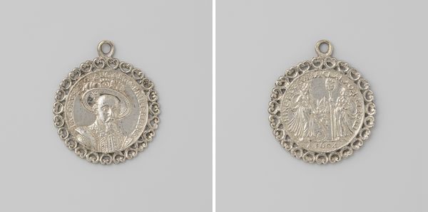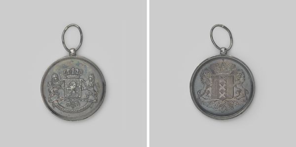 Curator: Here we have a metal relief engraving by H. Weckwerth commemorating the fiftieth wedding anniversary of Kaiser Wilhelm I and Kaiserin Augusta of Germany in 1879. What strikes you first about it? Editor: It’s austere, isn’t it? That silver-toned metal gives it a sense of rigid formality, a controlled power. There’s not much softness here. It feels less celebratory and more like a political statement, which, let’s be real, royal unions always are. Curator: Indeed. The Neoclassical style, quite prominent here, was often employed to invoke a sense of historical legitimacy and imperial grandeur. Think about it—Wilhelm I sought to consolidate power and project an image of a unified Germany through such state-sponsored art. Editor: The profiles of Wilhelm and Augusta certainly emphasize that ideal of imperial power, but I can’t help but see the inequality embedded within that image, the implied roles assigned to each person based on gender. His profile is so much more pronounced than hers. Curator: That's a sharp observation. Weckwerth consciously modeled it on classical imperial portraiture to project authority. It was distributed at official court ceremonies, serving as a propaganda piece that cemented the ruling family's place in German history. Editor: That’s it! We're looking at an object designed to legitimize a very particular kind of power—hereditary power—at a moment when social hierarchies were under enormous pressure. Every symbol, down to the laurel wreath on the reverse side, underscores that. The crown, specifically, signifies not just authority but a divinely sanctioned right to rule. Curator: Absolutely, it’s interesting to consider its original display context, too. Given the size, it likely would have been displayed or worn, prompting discussions and reinforcing those political ideas amongst various court circles. Editor: It’s so heavy with meaning—it speaks volumes about the use of art to perpetuate not just memories but ideologies. For me, it speaks to the enduring power dynamics encoded in even the smallest of objects. Curator: From my point of view, examining such an artwork compels us to look at the construction and maintenance of historical narratives. What stories do we tell ourselves and what purpose do they serve? Editor: Exactly, how do those stories impact issues of representation, gender, and class? The object becomes a space for understanding history, but also critiquing how that history gets used.