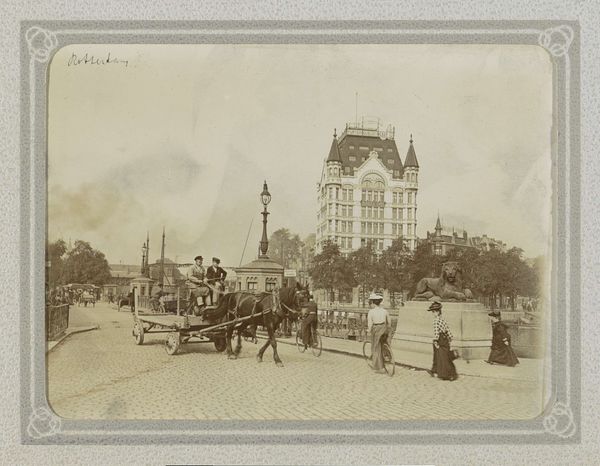 Curator: This photograph, titled "Marktkramen bij de Sint Antonieswaag op de Nieuwmarkt," captured by James Higson in 1904, offers us a glimpse into early 20th-century Amsterdam. Editor: It has an undeniable charm. The sepia tones evoke a strong sense of nostalgia and reveal the dynamic of commerce with those lovely market stalls clustered in front of the historic weigh house. Curator: Indeed. Higson's composition is quite intentional, framing the bustle of daily life against the imposing backdrop of the Sint Antonieswaag. It's a visual statement about the social and economic structures at play. Consider the implications of that architectural presence. Editor: You’re right to emphasize structure and context. What narratives are woven in by positioning working people with their laden carts right below symbols of civic authority? And what can this photographic record tell us about the development of consumerism and public space at that time? Curator: Precisely. And note the presence of the railway lines cutting across the foreground. This photography encapsulates the intersection of tradition and modernity, a tension that was reshaping Amsterdam's identity. Editor: Also, it really is impressive what Higson was able to express by focusing on the historical and architectural settings of a burgeoning global economy, connecting its development with labor history. I appreciate how it connects Dutch painting traditions with a newer technological medium. It’s not only documentary but aesthetic as well. Curator: Ultimately, Higson’s photography transcends a simple snapshot; it invites a deeper analysis of Amsterdam's complex societal fabric at the turn of the century. Editor: Yes, looking at the artwork critically allows me to view the historical events of the past, while allowing new ways of interpreting social events now and then. It’s all connected and influencing each other.