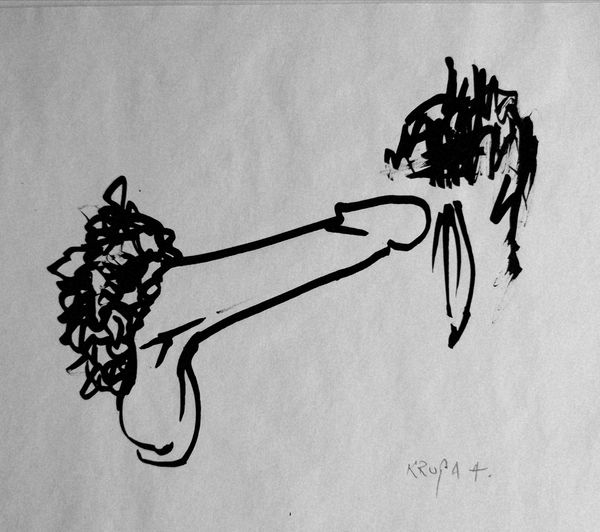 Curator: Well, isn't this just charming in a slightly unsettling way? Editor: Exactly. Alevtyna Kakhidze created this pen drawing in 2017; she calls it "Untitled. Strawberry Andreevna." Curator: Strawberry Andreevna... it has the ring of a tragic, misunderstood fairytale character. And those cheeks! Such a vibrant, almost feverish red. What do you make of the, let’s say, unconventional rendering of the face? Editor: The intentionally crude, childlike quality challenges our notions of portraiture, doesn't it? The simplified lines, the flattened perspective... it almost mocks the formal portrait tradition. Curator: It definitely throws the pomp and circumstance out the window! More like scribbles from a dream. And the hands at the bottom... Is that a signature or part of the artwork? Editor: That's the million-dollar question! It’s a flourish, ambiguous at best. Which reflects Kakhidze's engagement with daily socio-political realities that impact Ukrainian life, sometimes making very direct commentaries, and other times, letting the imagery speak on its own. Curator: "Speak" might be a strong word! Whisper, maybe? There's something wonderfully vulnerable in its simplicity. Do you think the anonymity, the unrefined character are related to feelings on war in the Donbas? Editor: Absolutely. Kakhidze often explores themes of displacement and the emotional landscape of conflict. The lack of a defined identity, represented in that deliberately rough style, mirrors the disorientation and loss that many experience during wartime. Curator: Ah, it makes so much sense now. So, this Strawberry Andreevna, whoever she is, could be any child in any war-torn land, their faces flushed not with glee, but with the heat of unrest and suffering? Editor: Precisely. And in that, the artist reminds us of the quiet acts of creative protest in an absurd environment—and perhaps an intimate scream. It's deceptively profound, wouldn't you agree? Curator: Deceptive, yes, like a sugar-coated pill. But ultimately, undeniably moving. I feel… lighter and more thoughtful having shared this conversation. Editor: Likewise. Kakhidze’s piece pushes us to look beyond the surface and question who has the authority to be seen and heard and what counts as being human. A lasting and meaningful takeaway.
