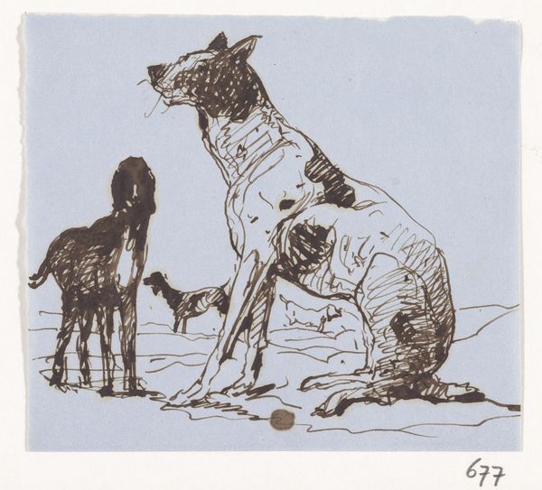 This small drawing, "Untitled (Horse and Lying Foal)" by Leo Gestel, captivates with its simple yet evocative lines. The composition is dominated by the two figures, a standing horse and a resting foal, rendered in a style that emphasizes form over detail. Gestel's use of line is particularly striking. Notice how he employs short, repetitive strokes to define the contours and suggest texture, almost like a topographic map. This technique flattens the image, reducing depth and focusing attention on the surface pattern. The lines are not merely descriptive; they create a sense of movement and energy, animating the otherwise still scene. The monochromatic palette further accentuates the formal qualities of the work. Without the distraction of color, the viewer is encouraged to appreciate the interplay of light and shadow, the balance of positive and negative space. This drawing invites us to consider how fundamental elements like line and form can convey both the physical presence and the underlying vitality of the natural world, revealing the essence of these creatures through a language of pure abstraction.