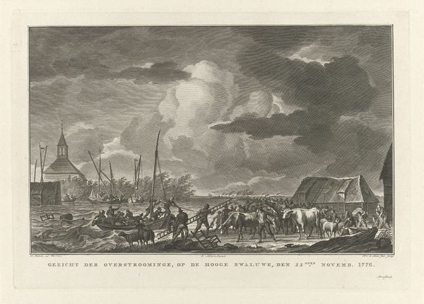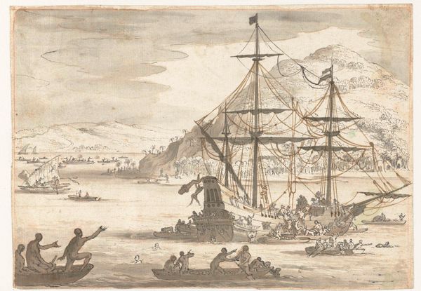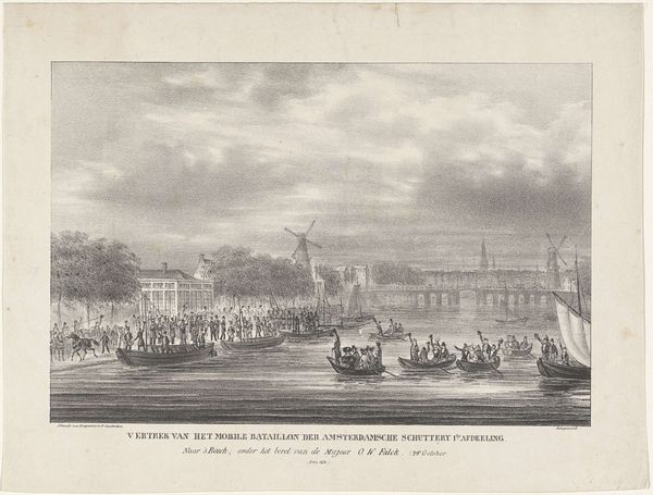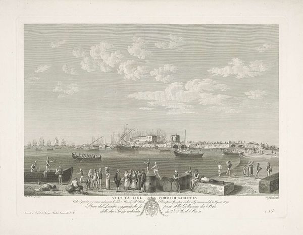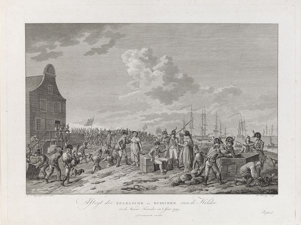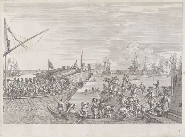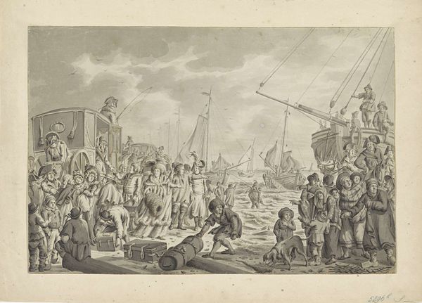 Curator: This engraving, created in 1814 by Willem van Senus, commemorates "Deze Kunstplaat, voorstellende den aankomst van zijne Majesteit," depicting the arrival of Willem den I in Scheveningen. A triumphant historical moment captured in print. What's your first take on this image? Editor: It feels both grand and a little stiff. The rigid lines of the ships and figures give it a formal, almost staged quality. The use of light and shadow, though subtle, creates a sense of depth, drawing the eye towards the arriving monarch. Curator: Considering it's an engraving, a medium reliant on reproduction, the dissemination of this image played a significant role in shaping public perception of Willem I’s return and the establishment of the Kingdom of the Netherlands. It’s propaganda, pure and simple. Editor: Yes, but how cleverly composed propaganda! Observe how the artist uses vertical lines, from the masts to the figures standing tall on the boats and on land. It reinforces a sense of stability and order. And the detailed rendering of textures, like the fabric of the clothing and the water's surface, adds a layer of realism. It’s quite masterful. Curator: And consider the location, Scheveningen, a humble fishing village that overnight became the site of national rebirth. The labor, materials, and printing processes made it possible for many people to see this pivotal moment. Editor: Precisely. The formal language echoes neoclassical ideals—order, reason, and a focus on civic virtue. And the light, airy atmosphere contributes to a sense of optimism and hope for the future of the newly formed kingdom. Note how every gaze, every gesture converges upon the King, who embodies the future, but is the light coming from the right? Curator: It’s a carefully crafted image intended to inspire a shared identity and allegiance. Editor: I agree. Looking closer, the engraving technique allows for such fine details that reinforce the work's propagandistic intent. What a wonderful example of neoclassical aesthetics meeting early 19th century printmaking. Curator: It offers such a potent reminder that the construction and reception of such visual narratives played a pivotal role in shaping national identity. Editor: Indeed. It underscores the lasting impact of the composition—an intersection between historical narrative, formal choices, and sheer propagandistic intent.