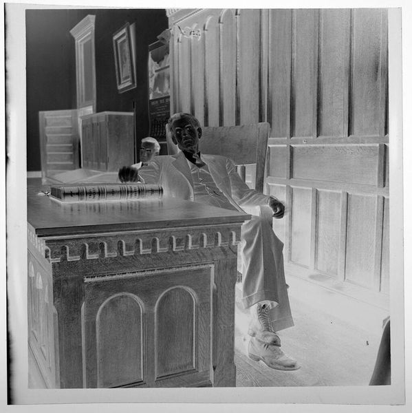 Curator: This photograph, simply titled "Untitled (couple being filmed by TV camera)," is by Jack Gould. It measures only 5.7 x 5.7 cm, a tiny window into what seems like a monumental cultural shift. What catches your eye first? Editor: That hulking KSD-TV camera! It’s like a technological idol, dwarfing the couple huddled by the piano. The whole scene feels so staged, self-conscious somehow. Curator: Indeed! The camera dominates, symbolizing the dawn of mass media's influence on private lives. It's fascinating how Gould captures this tension, the performance of identity under the gaze of the lens. Editor: And think of the piano, a symbol of domesticity, now relegated to the background. The couple, almost generic, could be anyone, playing a role for this new, hungry medium. Curator: There is such a vulnerability present; it's as though intimacy itself is up for grabs. Editor: Ultimately, it's a stark reminder of how easily we adapt to being observed, reshaping ourselves for the screen. Curator: Precisely. A poignant little snapshot of a world forever changed.