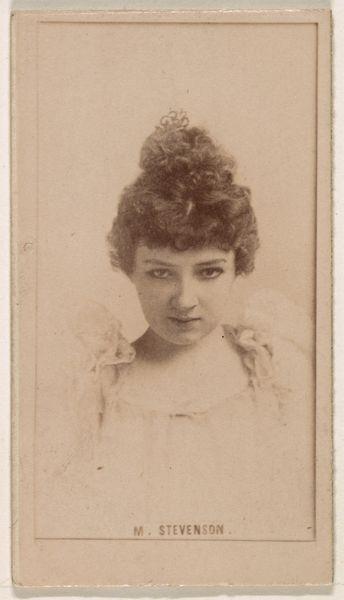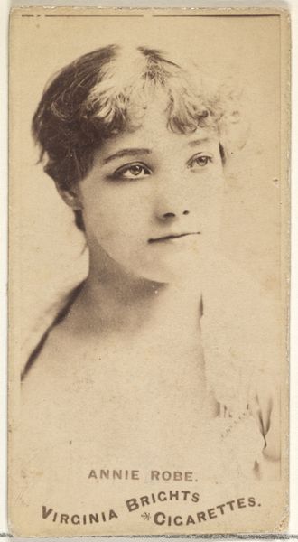 Editor: Here we have "Annie Robe, from the Actors and Actresses series (N171) for Gypsy Queen Cigarettes," created between 1886 and 1890 by Goodwin & Company. It's a print, probably based on a photograph. What strikes me is the almost dreamlike quality. What's your interpretation? Curator: It’s crucial to remember the socio-cultural context. These cigarette cards weren't just promoting a product; they were participating in a larger cultural project. By including "actresses," what kind of imagery did they help to perpetuate, and for whom? Editor: So you're suggesting that the choice of subject—an actress—wasn't arbitrary? Curator: Precisely. Actresses occupied a precarious position in society at the time, simultaneously admired and looked down upon. The inclusion of their portraits on cigarette cards brought them into homes and hands but framed within the context of commercial consumption. Notice also that they are named in the promotional text as “Gypsy Queen Cigarettes”, further associating these products with spectacle. Editor: That's a fascinating point. I hadn't considered how the context of consumerism impacted the image itself. Were there particular pressures or social functions inherent in celebrity endorsements then, influencing representations? Curator: Absolutely. The popularity of actresses ensured a wider audience for the product, yes, but it also subtly controlled their image and contribution. Consider who benefitted from circulating that particular visual, and what behaviors were normalized. Whose gaze does the portrait serve? Editor: I see what you mean. It seems like a simple portrait, but it reflects so much more about power and visibility in that period. Thanks! Curator: It's a potent reminder that even seemingly innocent images can be deeply entangled with social and political dynamics. Thinking about the history gives it a greater depth and interest!