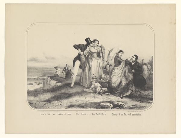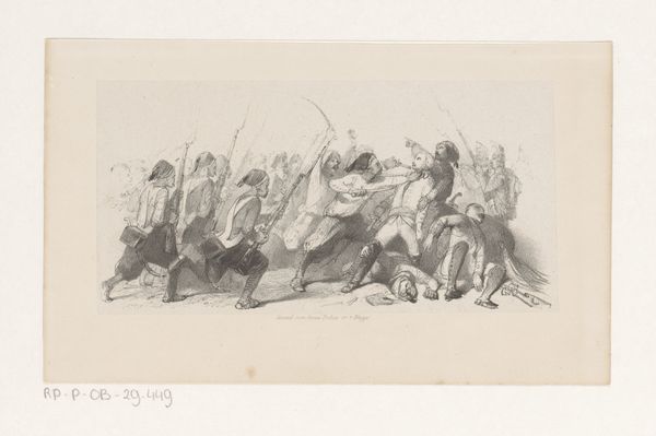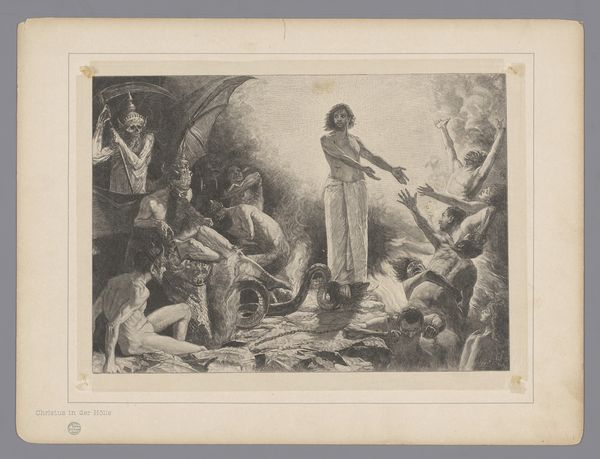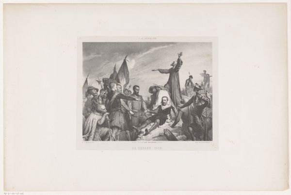 Curator: Welcome. We are standing before "Johannes de Doper predikend," or "John the Baptist Preaching," an engraving by Anthonie van Volkom, made sometime between 1847 and 1865. Editor: The engraving is incredibly detailed! The whole scene feels staged in a sort of theater where you can clearly see both John, but also everyone involved as he seems to touch peoples' lives in different ways. It certainly evokes a solemn, attentive mood. Curator: The print belongs to a broader trend of the 19th century where we see the rise of religious revivalism alongside print culture. Engravings like this allowed for wider dissemination of religious narratives. Van Volkom sought to capitalize on the public's hunger for easily accessible, yet artistically rendered biblical scenes. Editor: I see many symbolic details—the posture of John for example, as he carries that cross; the man prostrated before him, the palm tree representing life. They all suggest the transformative power of repentance. Does it indicate an actual spiritual awakening amongst its intended viewers? Curator: It reflects and influences that awakening, shaping public sentiment by presenting John the Baptist as an important figure whose ministry impacts everyone who hears it. This representation reinforces the Protestant values that dominated the 19th-century Dutch society, focusing on the accessibility and interpretability of the scripture. Editor: Absolutely! Also consider the cultural memory around the desert and the figure of the prophet. His stern gaze is set over the crowd in almost every image and reminds audiences of the continuity of God's work throughout history, as represented through powerful images. Curator: True. The image serves as a reminder of both social responsibility and spiritual calling, as it reflects and appeals to the 19th-century sentiments. Its production and reception also show us how cultural artifacts become social rituals. Editor: I'm walking away from this experience having noticed an interesting tension between artistic and religious expression—something worth thinking more about in other similar works. Curator: I think the visual dynamics displayed give us new insights into how religious teachings were popularized during times of societal change.