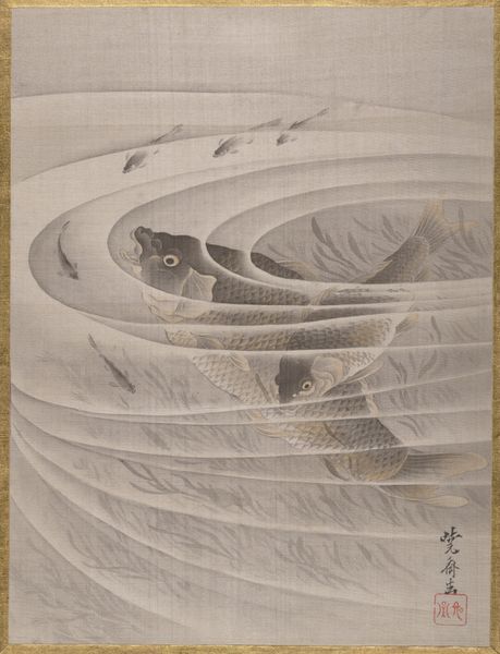 As koi (the Japanese word for carp) also means love, the carp is one of the emblems of good luck and two carp represent marital happiness. The strength expressed by the right carp might suggest that he is the male, whereas the elegantly swimming carp is the female. The right carp is captured in profile when he is almost completely out of the water and only his tail fin is still inside. The outlines of the waves that surround him were drawn with powerful, broad brush strokes that indicate the energy with which the water was dispersed. Much to the contrary, the left carp is quietly swimming in the water. Her body is depicted in a round S-form and her dorsal and tail fins create undulations. Tsukioka Settei (1710–1787) lived in the Osaka-Kyoto area where he was active as a painter, printmaker, and also book illustrator. Settei eventually founded his own branch of the popular ukiyo-e painting style. His paintings date from the latter half of his life. This pair of carp was painted in the winter of 1777 (tenth month) when Settei was 67 years old.