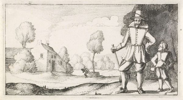 Editor: Here we have "Man with Walking Stick in a Landscape," an engraving by Dirk Eversen Lons, created around 1622. It strikes me as such a poised image, despite its rather humble setting. What do you see in this piece, considering the context of the Dutch Golden Age? Curator: Beyond the skillful technique typical of the Dutch Golden Age, I see a carefully constructed statement about class and social mobility. Note the man’s clothing – stylish but not overly opulent – and his confident posture. It suggests a rising merchant class, eager to display their status, but perhaps still tethered to the land. Consider how the landscape itself isn't just a backdrop. Editor: Tethered in what way? Curator: The very act of depicting a "common" landscape as worthy of art suggests a shift in perspective. Where earlier art might showcase purely aristocratic pursuits, here we see the emerging importance of the Dutch landscape. It's not just land to be owned, but a source of national pride and wealth for all. The figure, seemingly at leisure, profits off it. Doesn’t it almost feel like a commentary on early capitalism? Editor: That's fascinating! I hadn’t considered the landscape itself as a political statement. I was mostly focused on the figure. Curator: Look closely; it is about BOTH: figure AND landscape. In posing a seemingly ‘regular man’ like this, what societal message do you believe the artist is sharing? What questions of privilege, aspiration and self-expression do these symbols convey? Editor: It makes you wonder who this man really was and what his story might be. It definitely makes me consider the rising middle class in a different light. Curator: Exactly. By deconstructing art’s message, you are enabled to interpret social change more critically.