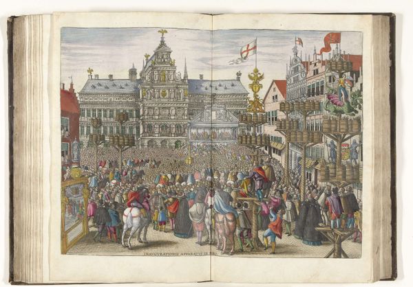 Curator: This captivating engraving is entitled *Vreugdevuren en vuurwerk op de Grote Markt, 1594*, or "Bonfires and fireworks on the Grote Markt, 1594," attributed to Pieter van der Borcht the Elder. Editor: It’s a very busy image! The scale and level of detail crammed into the print are really striking. Almost unsettling. You get this sense of a massive spectacle. Curator: Indeed. Van der Borcht depicts a public celebration, meticulously documenting the festivities occurring on the Grote Markt – the main square – to commemorate a victory, specifically a triumphal moment when cities in the Netherlands began throwing off Spanish rule. We see the architecture and clothing of the period, giving a glimpse into that society. Editor: Right, it's like an early form of propaganda almost? A controlled representation of triumph to reinforce political narratives. What's most striking is the use of fire - seemingly celebratory. Yet given the context of colonial struggle, I wonder, is it truly celebratory for everyone? Whose voices are muted in this representation of victory? Curator: A valid and critical point. The engraving offers an interesting view into civic celebrations during a period of intense political and religious upheaval, where power dynamics are clearly visible in the depiction of the town square itself. These weren’t merely neutral festivities. They are performances designed to cement and showcase newfound autonomy and political positioning. Editor: I find myself focusing on the shadowy areas of the image, searching for counter-narratives and subtexts beneath the layers of celebration. The dark engravings and shadows, contrasting against the fires, evoke this sense of questioning: Whose joy are we witnessing? Curator: Your attention to those elements really encourages me to explore this artwork with newfound considerations around power and subtext. Viewing such artworks provides a chance to revisit historical understanding using contemporary critical perspectives. Editor: It allows a multilayered approach and appreciation.