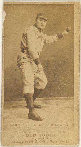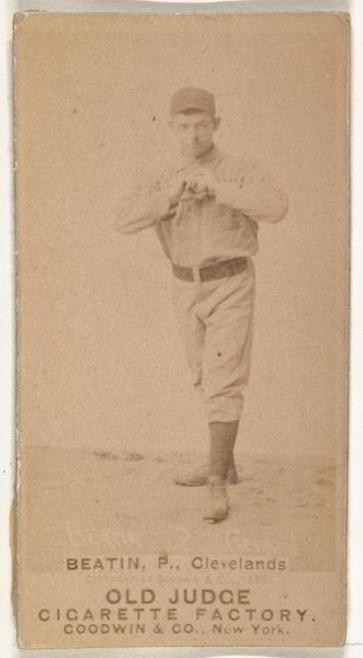 Editor: This is "Arthur Albert 'Doc' Irwin, Shortstop, Philadelphia," a photograph from the Old Judge series for Old Judge Cigarettes, made in 1887. It's a pretty straightforward portrait of a baseball player, but the sepia tone gives it a wistful, almost nostalgic feel. What stands out to you? Curator: What immediately strikes me is how this image operates as a historical document embedded within a matrix of commerce and popular culture. This photograph, produced as a collectible card for a cigarette brand, intersects with several key narratives of the late 19th century. It speaks to the burgeoning popularity of baseball as a professional sport, but also to the rise of consumer culture and advertising. Editor: So, more than just a picture of a baseball player, it's about… broader societal shifts? Curator: Precisely. Consider how the commodification of athletes through these cards contributed to the construction of celebrity and ideals of masculinity. Who was included, and who was excluded from these images? We must think about the power structures at play in determining representation during this era. Whose stories were amplified, and whose were erased? What can the visual language and composition of this piece reveal about prevailing attitudes and biases? Editor: That's interesting, I hadn't really considered that. I was just thinking about the aesthetics and, you know, baseball! Curator: And the aesthetics absolutely matter. The photographic techniques and printing processes, such as the gelatin-silver print method, allowed for mass production and dissemination of these images, which created a visual culture where individuals from different social strata engaged with these representations of celebrity. How do you think the photographic quality affects how we see this image now, in a contemporary context? Editor: I see what you mean. Knowing it was mass-produced for cigarettes definitely changes the way I see it. I guess it’s less about the individual player and more about what he represents. Curator: Exactly. We can now use it to examine advertising, popular culture, celebrity culture, and the beginnings of the sports industry, with an important view to issues of identity and representation. It’s a powerful thing to consider! Editor: This has really given me a fresh perspective on looking at art with an understanding of social issues.