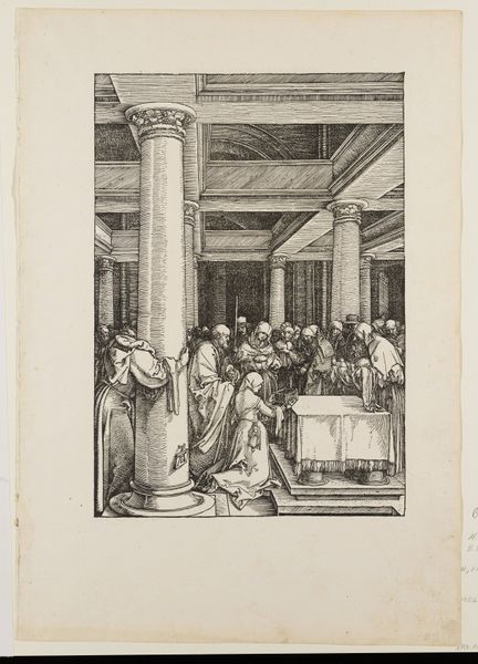 "The Presentation of Jesus to Simeon in the Temple, after Dürer," was made by Marcantonio Raimondi, sometime before 1534, using engraving. Raimondi, an Italian engraver known for his reproductions, here borrows from the famed German artist Albrecht Dürer. During the Renaissance, the circulation of images through prints played a crucial role in spreading artistic ideas across Europe. Consider how reproduction and authorship intersect here; Raimondi’s engraving serves as both an homage to and an interpretation of Dürer’s original vision. The scene depicts the biblical episode of Jesus' presentation at the Temple in Jerusalem. Note the expressions and gestures of the figures, from the kneeling woman offering a box, to the faces in the crowd who have come to witness this event. What does it mean to translate, or even borrow, another artist’s work? How does the act of copying change the original? This engraving prompts us to consider the complex relationships between artistic invention, cultural exchange, and the dissemination of religious narratives in the Renaissance.