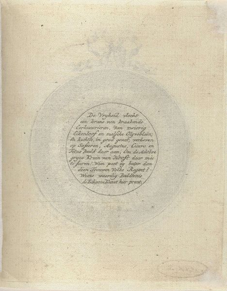 Editor: This is "Drinklied," created around 1658 by Gesina ter Borch. It's a drawing made with ink on paper. The delicate lines and swirling central form give it a whimsical, almost dreamlike quality. How would you interpret this work, focusing on its formal qualities? Curator: The use of line in "Drinklied" is particularly compelling. Notice the stark contrast between the ordered, almost architectural quality of the handwritten text above, and the almost organic, spiraling form below. Does that spiral possess a symbolic valence? Editor: It reminds me a bit of a vortex, like something is being pulled down or ascending rapidly, what significance does that hold with relation to the text on the upper portion of the paper? Curator: Indeed, its spiral nature creates dynamic tension, yet the limited tonal range-- the almost exclusively monochrome scheme--subdues that drama. We have a clear relationship being portrayed here. One section seems bound and trapped within set perameters whereas another shows itself unencumbered. How can the two be understood through those respective lenses? Editor: I suppose, seeing as it is titled Drinklied which can be seen as drinking song that each aspect can correlate with each other in meaning as one side details the lyrics and the other a free flowing sense of joy and uninhibited movement which comes with drunkenness? Curator: Precisely. The visual rhetoric employed establishes a semiotic relationship with the title itself, doesn’t it? Borch contrasts structure with fluidity. Editor: It's fascinating how the formal elements support the overarching theme! It's made me see the piece in a completely new way. Curator: The essence is appreciating how form informs meaning, revealing depths you hadn't noticed on the first inspection.