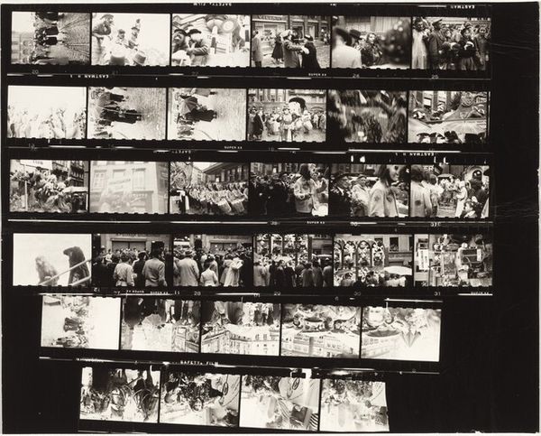 Curator: Immediately, I’m struck by the dense composition—all those small, grainy images crammed together. It's a contact sheet, but the effect is almost dizzying. Editor: Let’s delve into this fascinating piece. What we are viewing is Robert Frank's "Guggenheim 670--Reno, Nevada" from 1956, a gelatin-silver print and a compelling example of his groundbreaking work in American street photography. Frank challenged traditional photography conventions, offering raw glimpses into everyday life during a period of social and political upheaval. Curator: Exactly! And this format amplifies that sense of immediacy. We're not seeing polished, perfected images, but rather the artist’s working process laid bare. The sheer number of exposures screams exploration, a searching for the perfect shot… or maybe revealing the impossibility of one. The grit of the black and white tones adds to that feeling. Editor: These frames present fragmented glimpses into a consumerist culture, and perhaps a critique of its underbelly. Look at the central frames of the grid; rows upon rows of products, mirrored views of city streets that remind me of the blurred reality experienced by many Americans as they were being encouraged to relentlessly pursue the American Dream. His work frequently tackled themes of alienation and the stark realities often obscured by the dominant narrative of postwar prosperity. Curator: The stark contrasts he creates in these images is wonderful to decode, some frames barely registering information at all. This also forces a reading that suggests we look beneath the surface to the deeper and complex narratives of 1950’s society, specifically the unspoken racism and class divides he experienced as an outsider traveling across the US. Editor: Precisely, we are encouraged to ask ourselves whether these snapshots accurately reflected the human condition amidst rapid consumerism or offered an alternate version of progress itself? It remains an ever valid discourse today. Curator: Definitely. His use of seemingly casual composition adds another layer. It mirrors a sense of life as disjointed, of reality being filtered through different, and often unsettling perspectives. Editor: In conclusion, I think “Guggenheim 670” invites reflection upon our relationship with images, and their function as powerful agents of meaning, capable of subtly but significantly shifting perspectives and narratives. Curator: Agreed, it leaves me wondering about the stories behind these glimpses—the lives touched, the moments captured, and the overarching narrative woven by Frank’s unflinching eye.