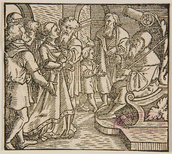 Curator: The sheer number of figures crammed into this tiny woodcut, "Multiplication of the Loaves," attributed to an anonymous artist, is quite remarkable. Editor: It feels almost chaotic, doesn't it? The linear hatching struggles to contain the energy. Curator: Yet, that controlled chaos emphasizes the miraculous nature of the event itself. Consider the visual hierarchy implied by the grouping of figures and the horizon line. Editor: Of course, and it's essential to remember the historical function of such prints—often used for widespread dissemination of religious narratives to a largely illiterate public. Curator: Precisely. The artist uses pattern and texture—look at the baskets overflowing with bread—to signify abundance and divine intervention. Editor: True, but that abundance carries complex social implications, reflecting anxieties around resources and access. Curator: A valid point. Ultimately, the formal rigor of the composition amplifies the miracle's impact. Editor: And, perhaps, its social potency. A potent little image, indeed.
