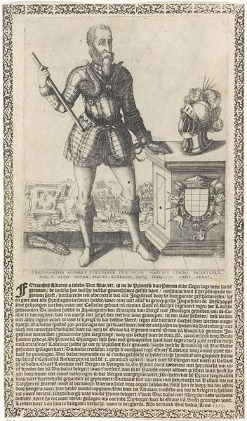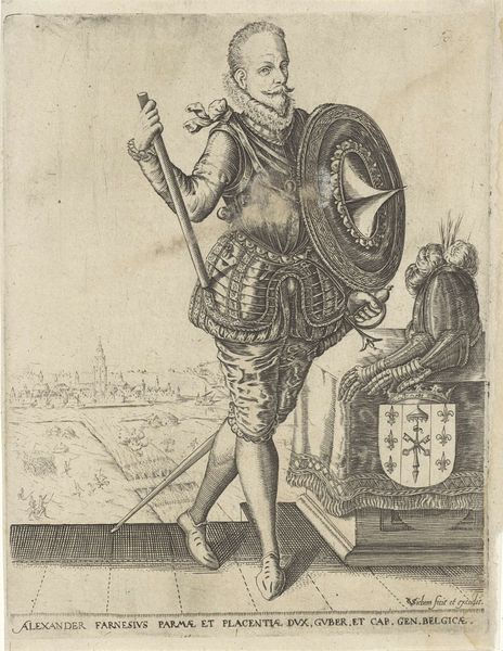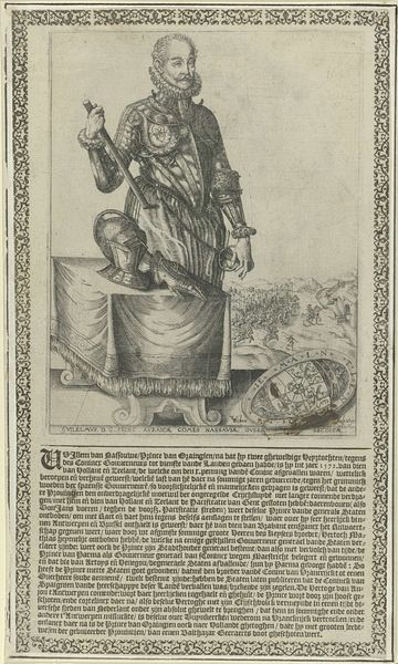 Curator: Here at the Rijksmuseum, we have an intriguing engraving titled "Portret van Filips II, koning van Spanje," or "Portrait of Philip II, King of Spain," created before 1611 by Christoffel van Sichem I. Editor: Immediately, it strikes me as having a formidable, almost somber tone. It's intricate and quite detailed, especially the king’s armour. He seems imposing but somehow... detached. Curator: Absolutely. This portrait, typical of the Baroque style and made through the medium of print, showcases the meticulous craft of engraving. Note the attention to the textures—the metal of the armour, the lace collar, even the king’s beard. These were all painstaking processes, requiring great skill and time. Editor: There's also a story here about power, right? The regal posture, the ships on the water behind him – hinting at naval dominance – plus his helmet bearing a shield; all communicate authority and ambition. The engraving, I'd venture, wasn't just a representation, but a political statement, one crafted for consumption and dissemination. Curator: Precisely. Engravings like these played a significant role in shaping the image of rulers, circulating their likeness and projecting power across geographical boundaries. Also observe the decorative frame surrounding the image and long passages of Dutch text: elements indicative of print's function in wider society during the Renaissance. Editor: It’s curious, isn't it, how such a controlled, calculated image, made with so much intention, can still evoke such a raw and multifaceted reaction centuries later? There’s a kind of vulnerability hiding behind the show of force. Curator: I find the power of material culture in revealing such complex histories truly remarkable. This print invites questions about the manufacturing and dissemination of such material during the 16th and 17th centuries. Editor: I suppose the charm of these old portraits lies in finding glimmers of humanity behind the veneer of power. A dialogue across centuries captured by craft.
