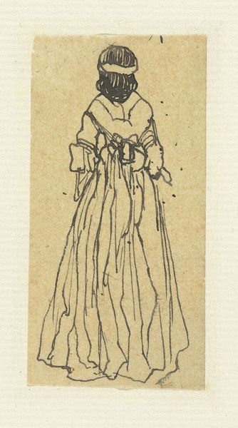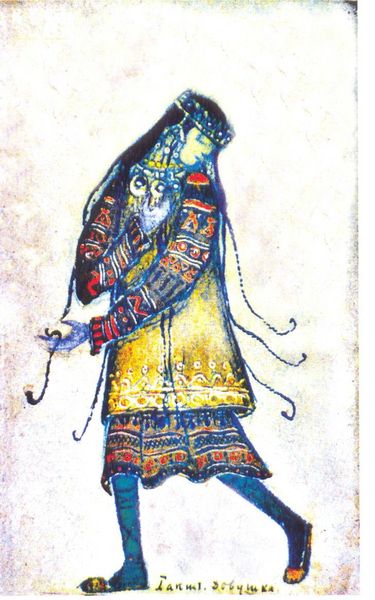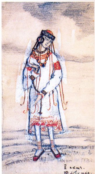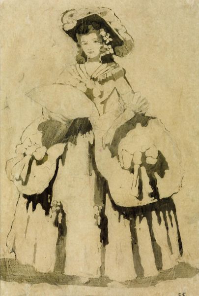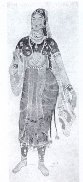 Editor: This is Nicholas Roerich’s watercolor, *Girl*, from 1913. The figure almost seems to float on the paper. What do you see in this piece? Curator: Well, instantly, I'm drawn to the intricate patterns adorning her costume – those bold reds and geometric shapes are like fragments of a forgotten language. Don't you think they resonate with a sense of cultural memory? Perhaps invoking pagan or pre-Christian beliefs? Editor: I hadn’t thought of it that way. I was focused on how delicate the lines are for a costume design. So the pattern and colors hold meaning beyond aesthetics? Curator: Absolutely! Color itself is a potent symbol. The red could signify life force, energy, and the connection to the earth – common threads in many ancient mythologies. Also notice how the costume emphasizes her braids and circular ornaments. Do you think these are indicators of social status? Ritual significance, even? Editor: It makes me wonder what the intended context for this costume was. It’s like Roerich embedded layers of history within a single image. I see her differently now, less as a design, and more as a carrier of meaning. Curator: Indeed. And through such persistent visual symbols, we keep those memories alive. A girl becomes not just a girl, but a representation of generations past. Editor: This really highlights how art can function as a cultural artifact and time capsule simultaneously. Curator: Precisely. Every detail—line, color, ornament—serves as a bridge connecting us to the cultural psyche.