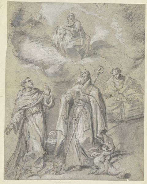 Curator: Here we have "S. Giovanni Alberti Fiorentinos historie. Helgenen og den ledsagende munk giver en tigger deres sidste brød," a drawing by Jan van der Straet, dating somewhere between 1523 and 1605. Editor: It's instantly striking how delicate yet dramatic the scene is! The whole drawing seems to breathe with generosity despite the poverty depicted. The landscape is beautifully rendered with just simple ink lines. Curator: Yes, it’s all about the line work, isn't it? Looking closely, you can see the pen and ink medium really emphasizes the folds of the robes and the contours of the figures. It's fascinating how such modest materials can create such a compelling narrative. Consider the socio-economic context of its creation: paper wasn't always easily attainable, and yet, here it's being used to depict the act of charitable giving. The whole drawing then seems an embodiment of what it shows! Editor: I agree entirely! I keep getting drawn back to the beggar’s face. There is such a humanity in it, and it tells an entire story in the sparse lines creating his weathered skin. You almost feel the texture of the paper beneath the ink mirroring the texture of the rough spun fabrics the beggar wears! Curator: It highlights the relationship between labor and representation, right? The labour that went into creating paper in the Italian Renaissance allowed it to also represent different forms of manual labour – as the work and trials are etched into the beggar's face! This work encourages us to appreciate that everything has a value beyond the purely aesthetic. Editor: Absolutely. This drawing does more than just illustrate a religious narrative; it brings a story of human connection vividly to life in such humble materials. The stark simplicity somehow amplifies the power of the act itself. Curator: Indeed, the materiality allows the meaning to truly resonate with its viewers! Editor: It’s a quiet testament, beautifully wrought, a study in humility in all ways.