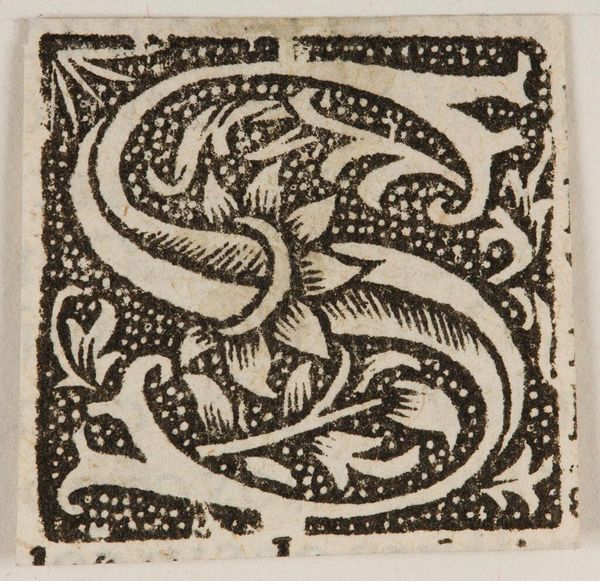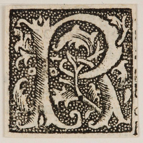 Editor: Here we have an initial "P", made by an anonymous artist. It has a somewhat medieval feel to it, doesn't it? What strikes you most about the composition? Curator: The density of the forms, both organic and geometric, creates a tension. Note the counterpoint between the sharp corners and the swirling foliate designs. The black field defines the white space, giving equal weight to both. Editor: So, it's about the interplay between the shapes, not necessarily the letter itself? Curator: Precisely. One could argue the letter is merely a structural armature for a more complex arrangement of forms and textures. Did you notice the tiny arrow detail? Editor: No, I missed that completely! I guess there's more to this letter than meets the eye. Curator: Indeed. The piece reveals a fascinating dialogue between representation and abstraction.