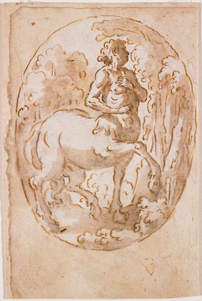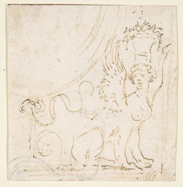 Editor: So, here we have "Lion with Tendrils," a drawing in ink from somewhere between 1770 and 1780, artist unknown. It strikes me as rather ornamental, almost like a furniture design. What jumps out at you? Curator: Ornament, yes, but with a roar, wouldn't you say? Imagine that lion, that posture, transposed onto a garden gate – suddenly you have power contained, tamed. What does containing power make you think about? I imagine gilded cages, societal constraints and the decorative…hiding the beast within. Is that beast still wild and dangerous even when “framed”? Or it is diminished? Editor: That’s a very vivid image! So you're seeing this more as a comment on society's control, not just pure decoration? Curator: Well, isn't all decoration commentary of a kind? This baroque exuberance, these swirling tendrils *around* the lion – do they protect, confine, or even mock it? Is this anonymous artist presenting us with a design, or a dilemma? And those almost casual strokes… do you think that it means something in terms of symbolism? Editor: That makes me wonder about the original purpose. Was it a sketch for something larger, or a statement in itself? The anonymity is also so interesting – makes me wonder who this artist was, what context shaped his message, his vision. Curator: Precisely! And in its unknowable origin lies its lasting allure, no? It invites endless speculation, reflections on power and appearances, beasts, cages… I might spend an eternity musing! Editor: Well, I am thankful for this new perspective. Thank you so much for taking a moment with me to ponder this drawing.